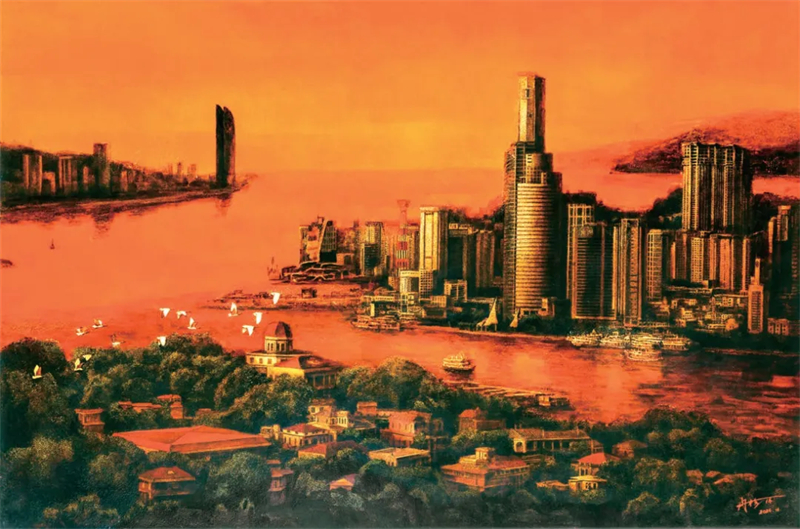 漆畫《港灣廈門》是一幅充滿詩意與深邃意蘊的藝術作品,生動展現了廈 門這座城市的獨特魅力。