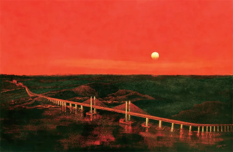 漆畫《平潭公鐵大橋》,以其獨特的藝術視角捕捉了平潭綜合實驗區的美好前景,象征著中國改革開放不斷探索、不斷深化的進程。