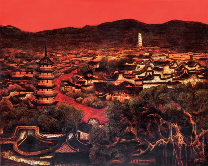漆畫《巷弄回聲》是一幅深具情感與歷史深度的藝術 作品,旨在通過獨特的藝術形式,展現三坊七巷這一 歷史文化街區與其紅色記憶交融的歲月。