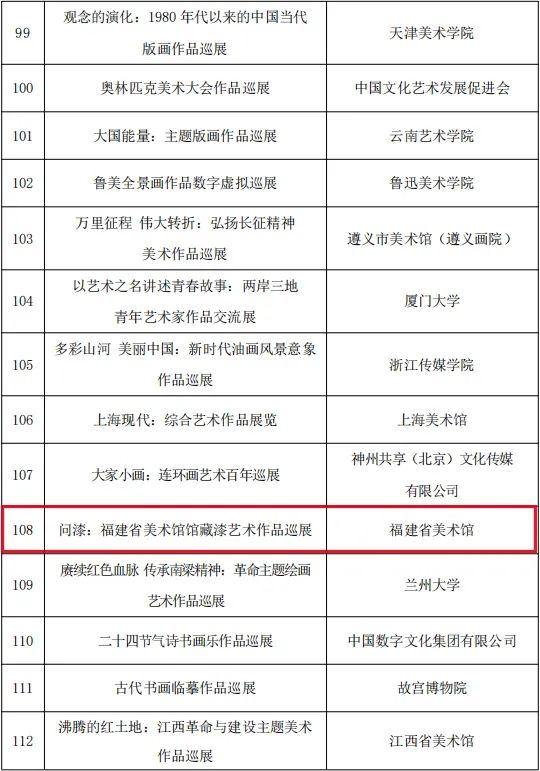 近日,國(guó)家藝術(shù)基金管理中心公布《國(guó)家藝術(shù)基金(一般項(xiàng)目)2025年度資助項(xiàng)目名單》,經(jīng)專家評(píng)審,國(guó)家藝術(shù)基金專家委員會(huì)復(fù)核、理事會(huì)審定、項(xiàng)目公示,我館“問漆:福建省美術(shù)館館藏漆藝術(shù)作品巡展”獲得傳播交流推廣項(xiàng)目立項(xiàng)。