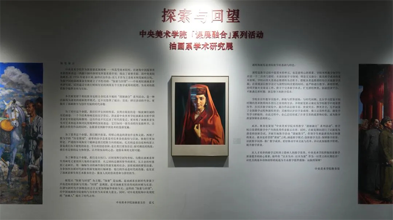此次展覽分為四個板塊:新中國美術與油畫系、油畫系素描與特色基礎課程、油畫系早期紙本作品及油畫系社會實踐與藝術考察,主要展示了自二十世紀五十年代至今的300余幅作品,以及九十年代的專業教案等。展覽以“探索與回望”為主題,“探索”代表著在新時代背景下,油畫系的創新與開拓實踐;“回望”則是對油畫系歷史傳統的追溯與反思,同時也向中央美術學院及其“油畫人”提出了時代之問。