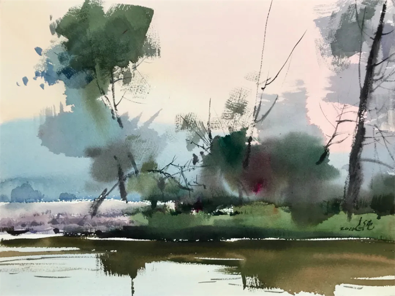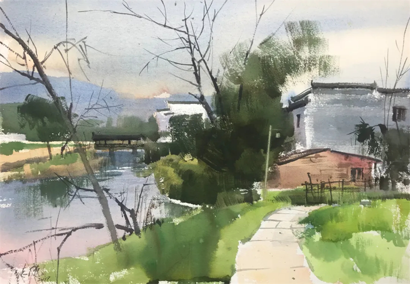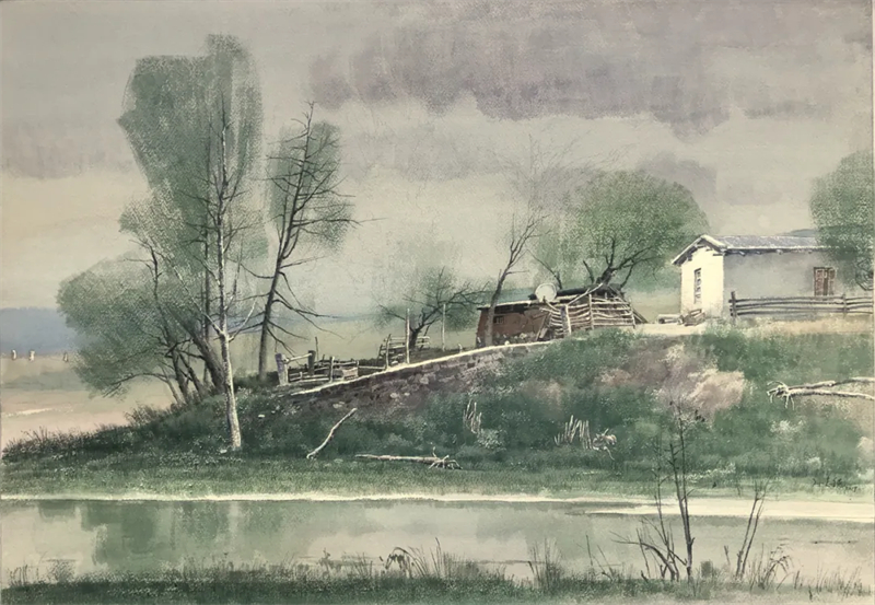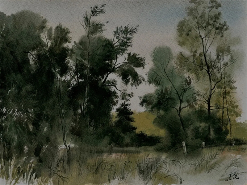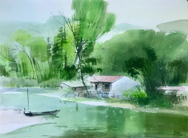 孫志純的水彩畫,畫面大多簡約質樸、清透,綠意盎然。畫面中經常出現的是各種各樣的灌木和喬木,是汩汩的溪流、純凈的天空,是微微的南風、古樸的房子。偶爾出現的行人、勞動者和飛鳥使得畫面更加靈動有活力。他的畫面清爽簡練,讓人看起來輕松愉悅。