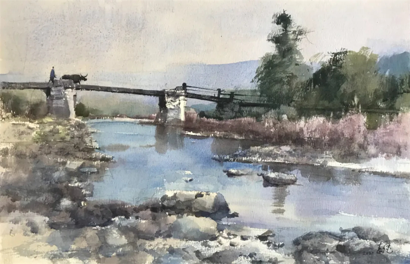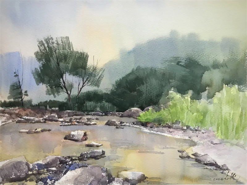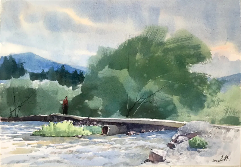 孫志純 故鄉的小河 水彩 32cm×51cm 2021年