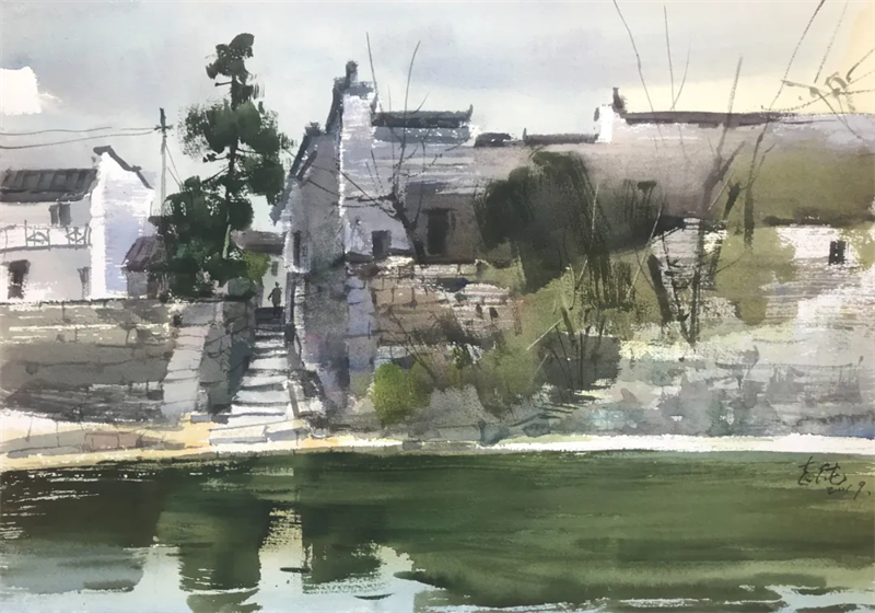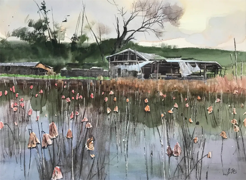 作為藝術家,孫志純最傾心的就是鄉村田野,他每年都要外出寫生,在大自然的靈山秀水中汲取營養,所謂“外師造化,中得心源”。在那干打壘的老樓面前,他會久久凝視,他還喜歡鄉村的歷史和故事,并把它們都吸收到畫作里。他的技法之嫻熟、凝練,不論是濕畫法還是干濕畫法,都將水之靈氣運用到極致,甚至任憑造化的安排,讓畫面隨著水汽氤氳、順著雨滴變化。