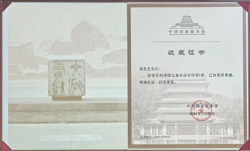 2024年,陳禮忠作品《賡續文脈》壽山石印章1座被中國國家版本館永久收藏。