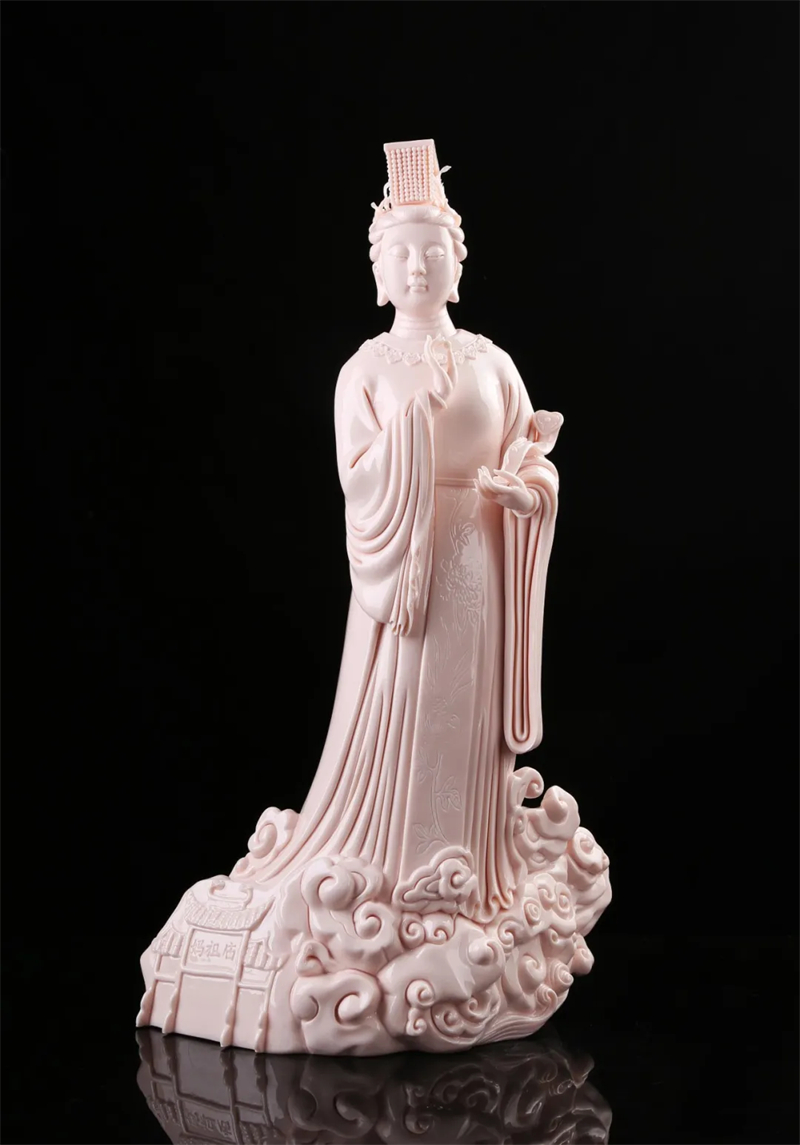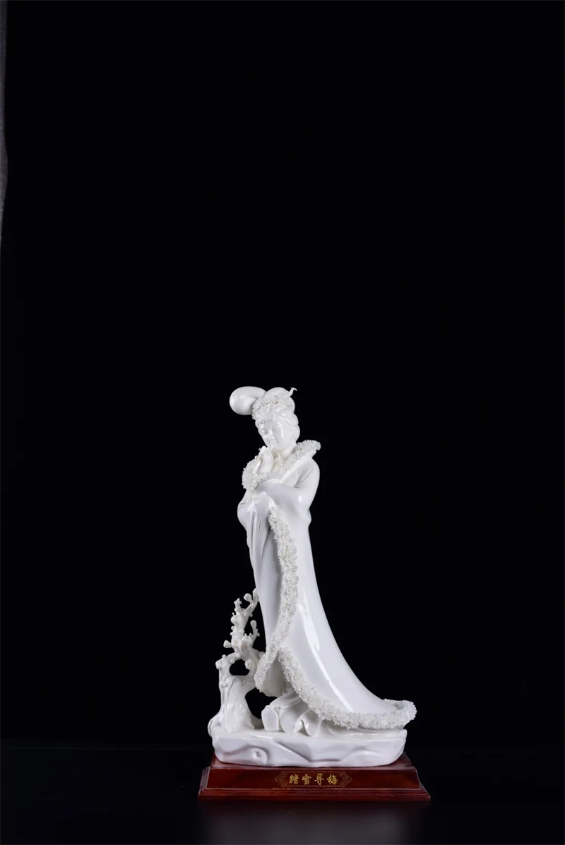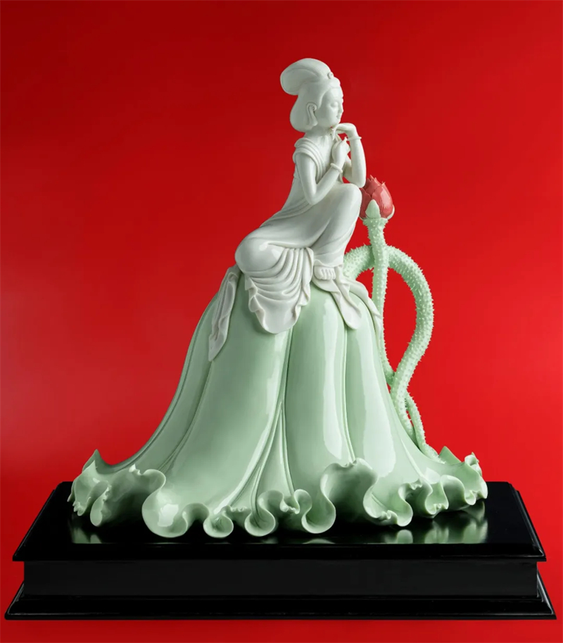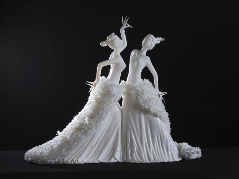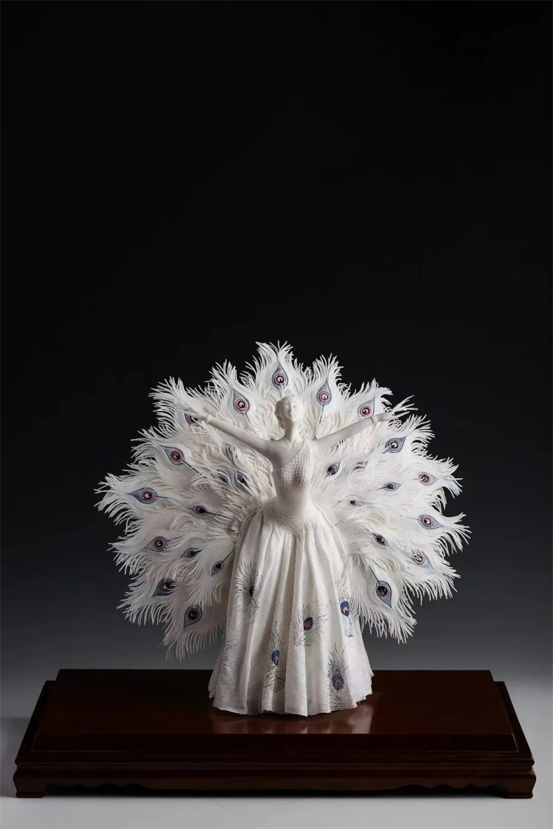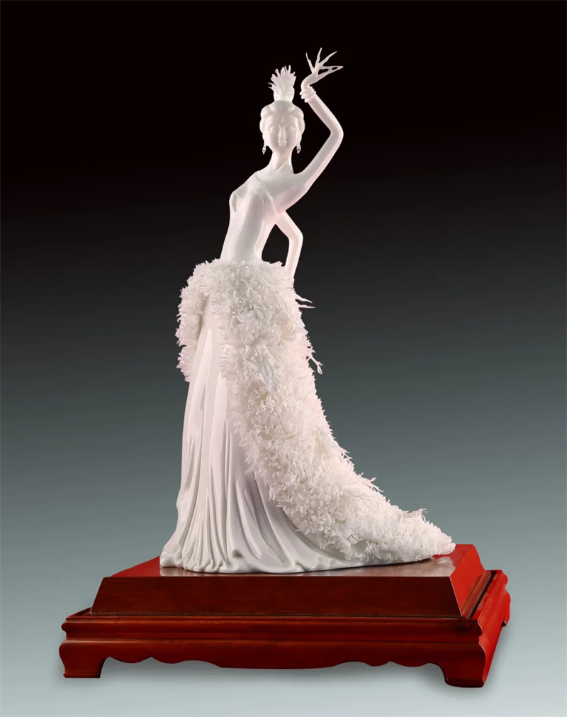 林靈月頂著壓力,通過著無數次的嘗試與調整,終于克服了一個又一個技術難關,使得作品中的每一根羽毛都保持其完美的形態,使得人物服裝部分更加輕盈飄逸,完美展現了女舞者的曼妙身姿。這樣的工藝創新,不僅突破了傳統德化白瓷圓潤、飽滿、團塊的造型風格,更將白瓷工藝推向了一個新的工藝極限。林靈月以技藝為依托,以現代藝術的寫實手法為方向,來推動德化白瓷傳統工藝的藝術轉型與工藝創新,讓世人見識到了陶瓷藝術的無限可能。