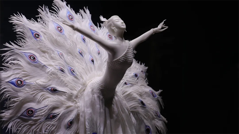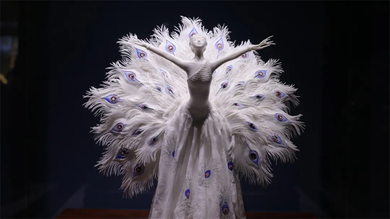 這件《雀羽生輝》在制作上也有極高的難度。舞者背后的這個孔雀屏由無數孔雀翎組成,而每一根孔雀翎都有細如發絲的羽毛纖維組成,作者用寫實的手法、手工“捏塑”的方式來展現羽毛的精致細節與蓬松質感,無疑是需要非常高超的工藝技巧作為支撐,完整這樣的作品必然是一項極為艱巨的任務。在制作泥胚時,每一根羽毛的線條都需要精準地把握,稍有不慎便可能導致整個作品的失敗。而在燒制過程中,這些脆弱的羽毛更是極易斷裂。每一個環節上至要稍有瑕疵,就會在下一個工序中讓整個作品前功盡棄。同時,舞者身上薄如輕紗的服裝也是另一難點,薄胎技藝對瓷器的厚度與穩定性要求極高,她竟用陶瓷這種堅硬的材料,創作出了絲綢紗巾般的柔軟質感。