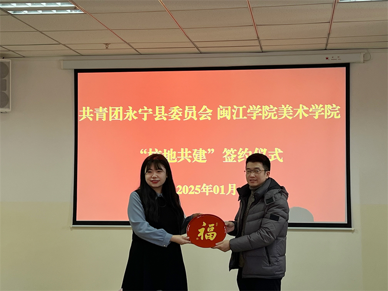 座談結束后,在所有與會人員的共同見證下,閩江學院美術學院與共青團永寧縣委正式簽署“校地共建”協議。這一簽約標志著雙方進入更深入、更廣泛的合作階段。隨后,閩江學院美術學院還精心準備了由其設計團隊精心制作的漆盤、五福文創產品作為紀念品贈予永寧縣,這份禮物寄托著對永寧縣未來發展的美好祝愿。
