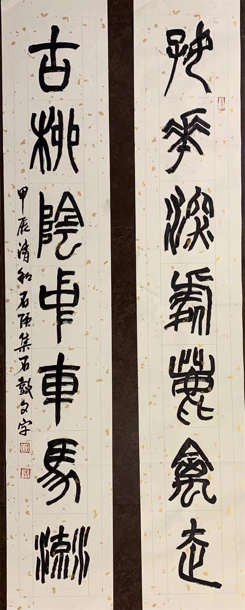 在石強(qiáng)看來,篆刻并非簡單的刀石交鋒,而是心與物、情與景的交融,是藝術(shù)家內(nèi)心情感的真實(shí)流露與抒發(fā)。因此,他在繼承傳統(tǒng)篆刻藝術(shù)的基礎(chǔ)上,不斷融入自己的個(gè)性和創(chuàng)新元素,將對金石文化的深刻理解融入其中,他的金石篆書作品剛?cè)嵯酀?jì)、神韻飄逸,或古樸典雅,或大氣磅礡,形成了自己獨(dú)特的拙樸書風(fēng)與篆刻風(fēng)格。