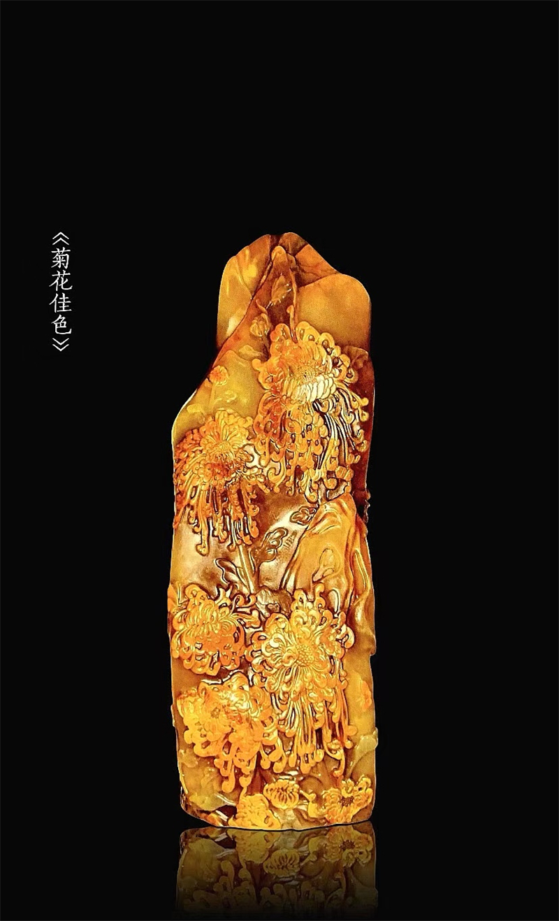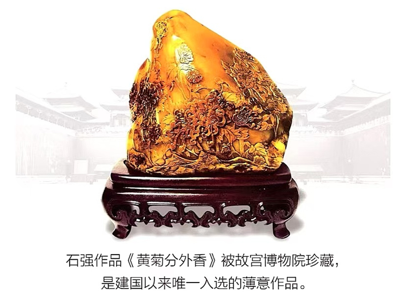 早在2009年,石強(qiáng)的金石薄意作品《黃菊分外香》便有幸被北京故宮博物院收藏。這部作品體現(xiàn)了石強(qiáng)在金石薄意上的深厚造詣,也是新中國成立以來第一件被故宮珍藏的壽山石薄意作品,推動(dòng)了壽山石薄意技藝在國內(nèi)外的傳播與發(fā)展。