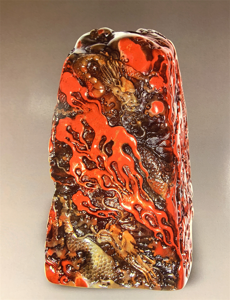 此后,石強(qiáng)先生的藝術(shù)之路高歌猛進(jìn)。2013年北京秋拍其壽山石薄意作品《東方韻中國龍》1610萬成交,該作品單克成交價(jià)達(dá)1.5萬元,創(chuàng)造了壽山石大紅袍石新的成交紀(jì)錄;2015年北京瀚海春拍,石強(qiáng)金石作品壽山石大紅袍《漢龍神韻》以195.5萬元成交;2019年,他的大紅袍石篆刻作品《流芳千古》被江西大余牡丹亭博物館收入囊中,成為該博物館的重要藏品,證明了其作品的收藏價(jià)值和文化意義。