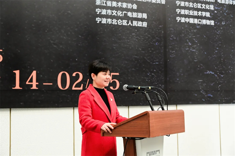 浙江省文聯副主席,寧波市文聯主席、黨組書記楊勁,中國美協漆畫藝委會主任陳金華、副主任兼秘書長湯志義,浙江省美協駐會干部、四級調研員陶將,寧波市文旅局副局長江武吉,中共寧波市北侖區委常委、宣傳部部長宋林權,寧波市北侖區人民政府副區長、寧波經濟技術開發區管委會副主任儲楊洋等出席開幕式。寧波市北侖區文旅局黨委書記、局長蔡建萍主持開幕式。