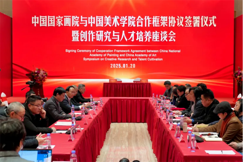 【編者按】1月20日,中國國家畫院與中國美術(shù)學(xué)院合作框架協(xié)議簽署儀式暨創(chuàng)作研究與人才培養(yǎng)座談會在中國國家畫院明德樓舉行。座談會由中國國家畫院辦公室主任董雷主持,何加林、韓緒、邢少臣、張捷、袁學(xué)軍、韓亮、方向、盛天曄、趙培智、劉海勇、謝小銓、王益、沙永匯、鄧柯、陳明、邱雷先后發(fā)言。中國國家畫院院長、中國美術(shù)家協(xié)會副主席劉萬鳴作總結(jié)發(fā)言。
