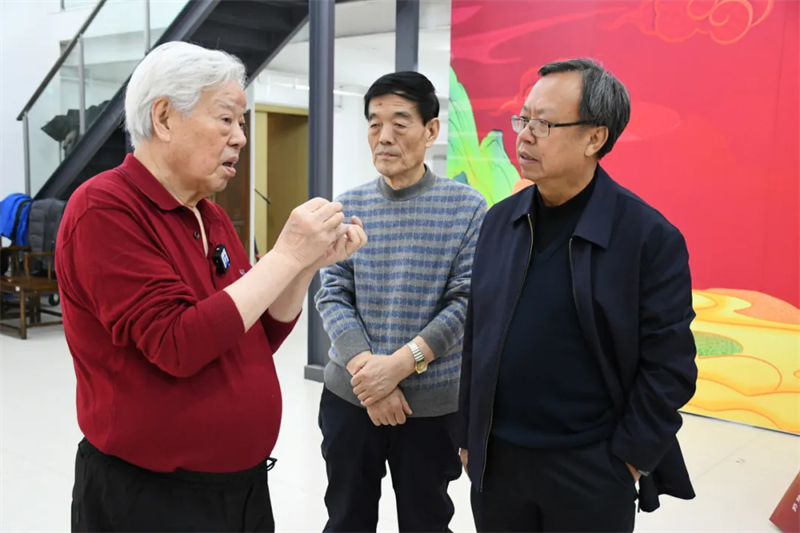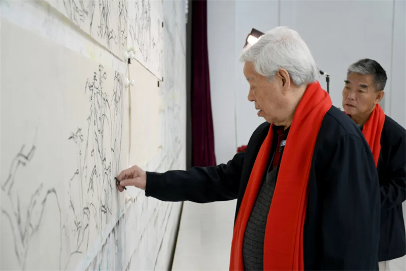 為了鼎力助陣本屆“大美之春”,將這幅作品打造成真正的精品力作,兩位藝術(shù)家以精湛的技藝、飽滿的熱情、默契的配合聯(lián)袂繪制巨作,并且以近乎苛刻的標(biāo)準(zhǔn)對(duì)待創(chuàng)作過程中的每一個(gè)細(xì)節(jié),例如僅“小稿”就起草了六版之多,對(duì)創(chuàng)作中的重點(diǎn)環(huán)節(jié)也要仔細(xì)斟酌、反復(fù)推敲。他們不顧自己年事已高和身體疲憊,夜以繼日地連續(xù)創(chuàng)作達(dá)數(shù)日之久,終于將一幅完美的《高風(fēng)頌》呈現(xiàn)在世人面前。