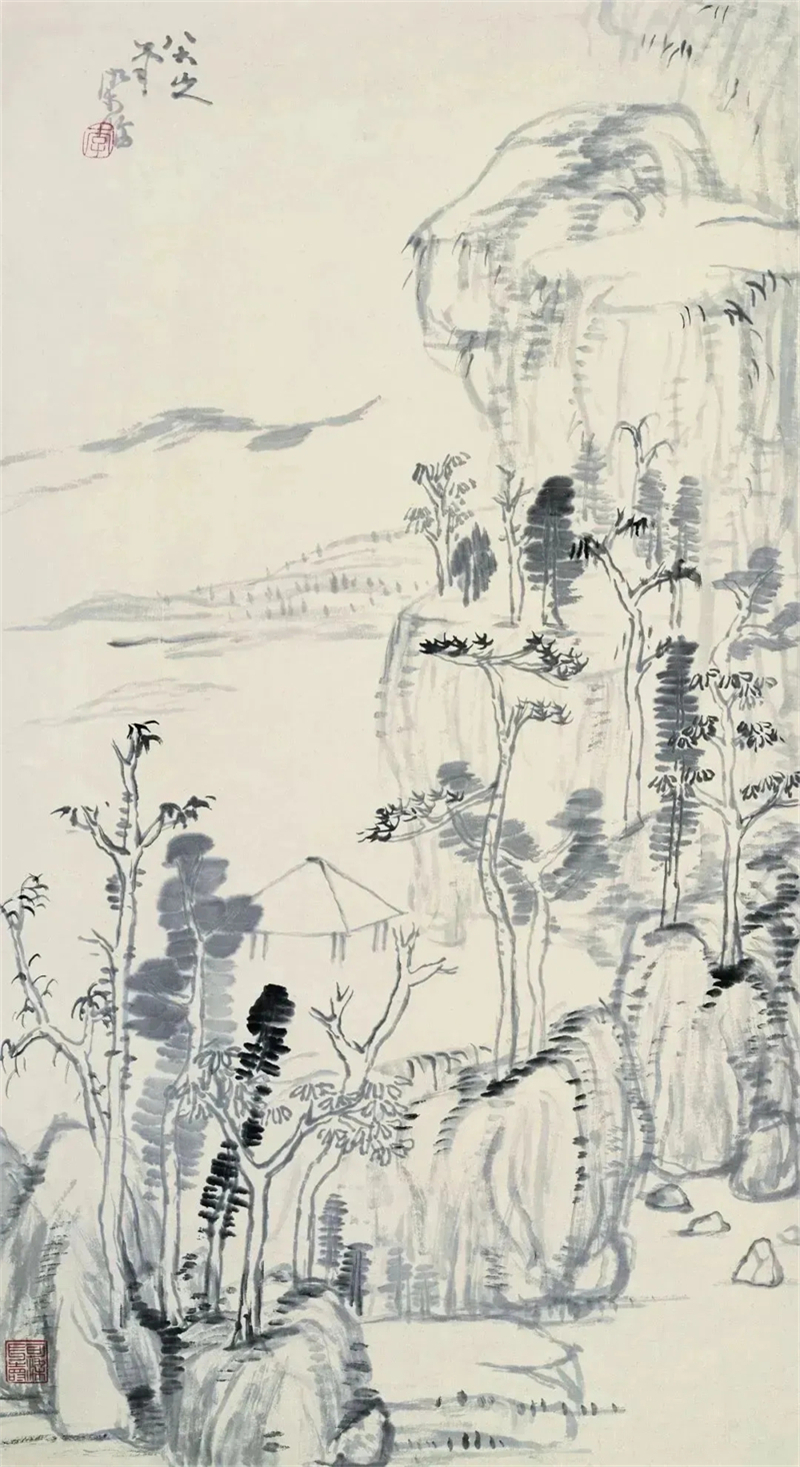 郭味蕖 臨元吳鎮山水 紙本水墨 117.5cm×26.5cm 1940年代 郭味蕖美術館藏