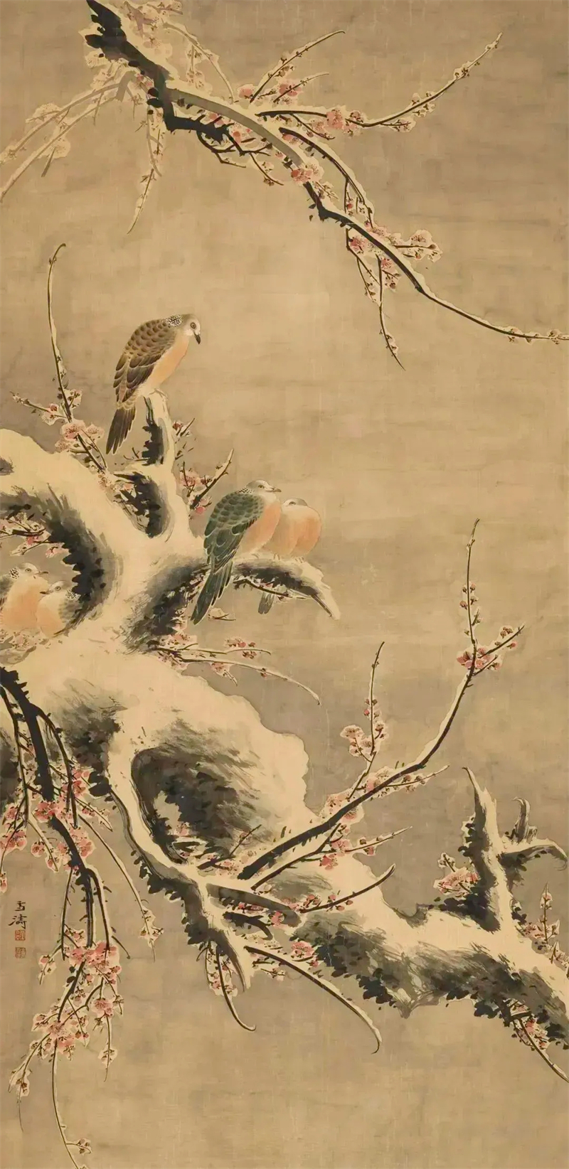 王雪濤 臨明呂紀《雪梅斑鳩》紙本設色 165cm×81cm 1950年代 王雪濤紀念館藏