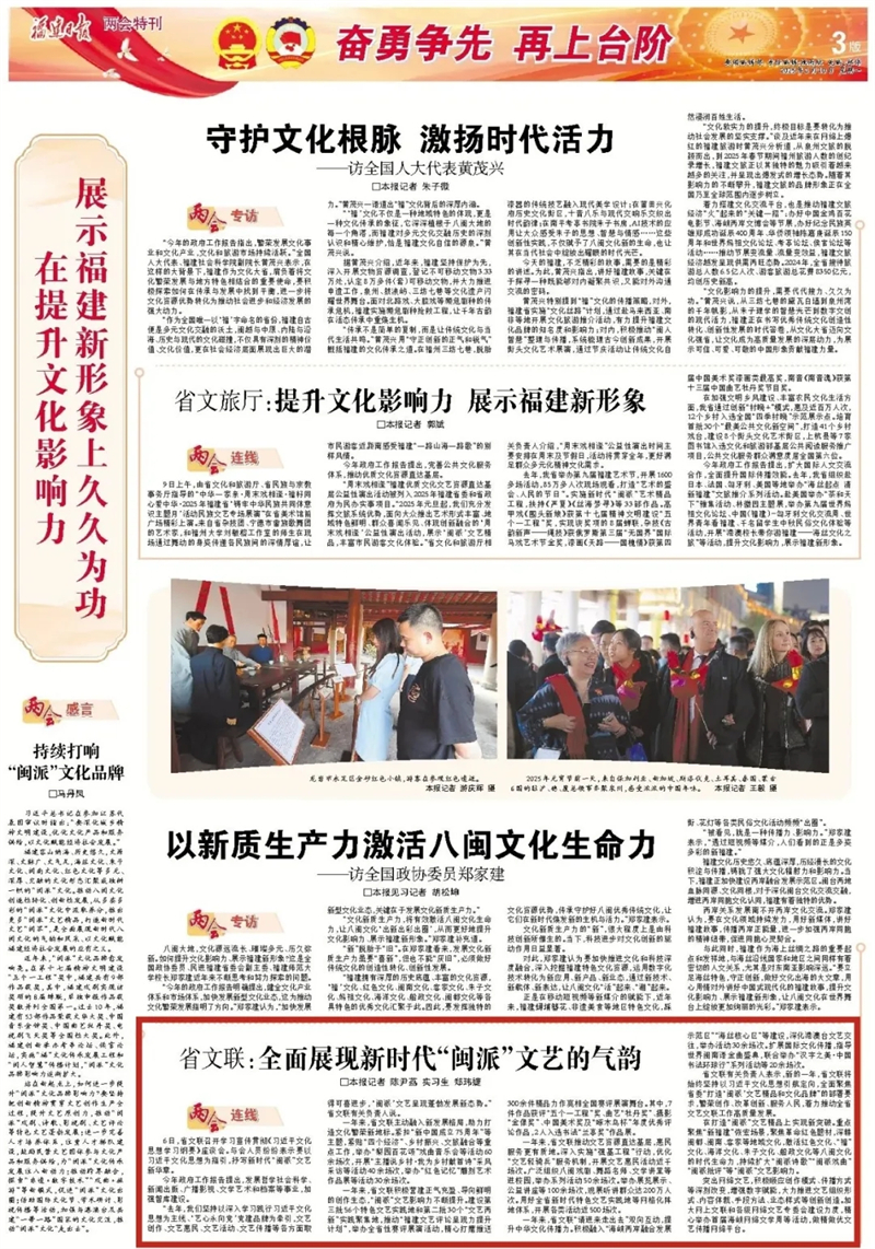 3月10月《福建日報·兩會特刊》第3版“奮勇爭先 再上臺階”專版“兩會連線”專欄以《省文聯:全面展現新時代“閩派”文藝的氣韻》為題,詳細報道了全省文聯系統緊緊圍繞習近平總書記關于“在提升文化影響力、展示福建新形象上久久為功”這一重要要求和省委關于“打造‘閩派’文藝精品和文化品牌”這一部署,持續深化拓展"三爭"行動,切實聚焦“出作品、出人才”,奮勇爭先、再上臺階,展示了去年的工作成效,展望了今年的工作謀劃,著力推動全省文藝文聯工作高質量發展。