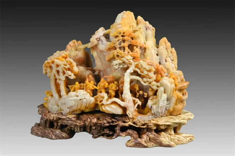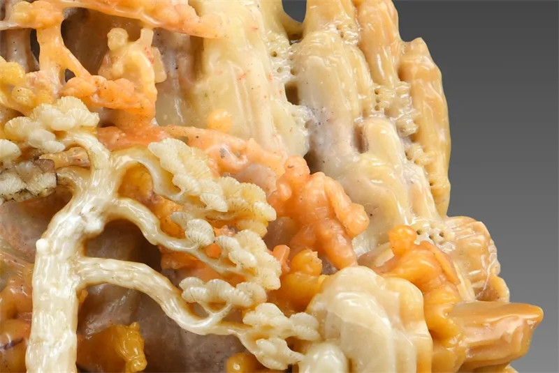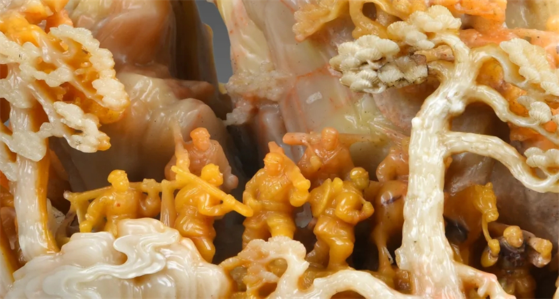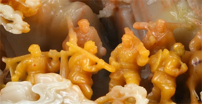 《長征》取材上等壽山銀包金奇降石,創(chuàng)作于六七十年代,是郭功森大師對紅軍長征不朽史詩的深情頌歌。他以精湛的刀工,巧妙融合石材的天然韻味與紅軍戰(zhàn)士的英勇形象,山川險阻與戰(zhàn)士堅韌相得益彰。作品中,紅軍戰(zhàn)士姿態(tài)各異,栩栩如生,展現(xiàn)了他們面對艱難困苦仍勇往直前的革命意志。這件作品不僅是石雕藝術(shù)的瑰寶,更是歷史與藝術(shù)的完美融合,讓人在欣賞之余,油然而生對革命先烈的崇高敬意。