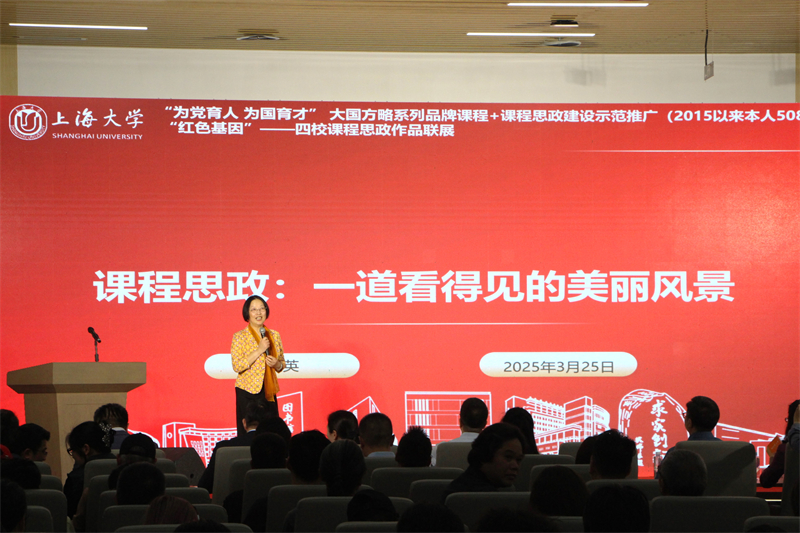 特約嘉賓上海大學教務部副部長顧曉英教授作了主旨發言,顧曉英認為,四校課程思政作品展是交流與融合的平臺,可以通過共同開發課程,打造聯合線上課程,各校學生合作完成大型的藝術作品,深化課程思政育人實效。她分享了“12344”課程思政建設體系的上大風景,包括分層分類-新思想點亮的專業教育育人風景以及“紅色項鏈”-串聯高校黨史類課程聯盟風景的寶貴經驗。