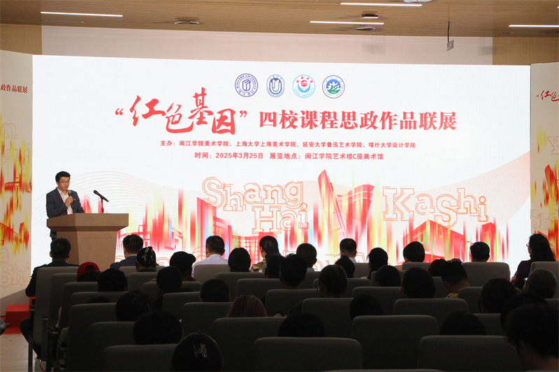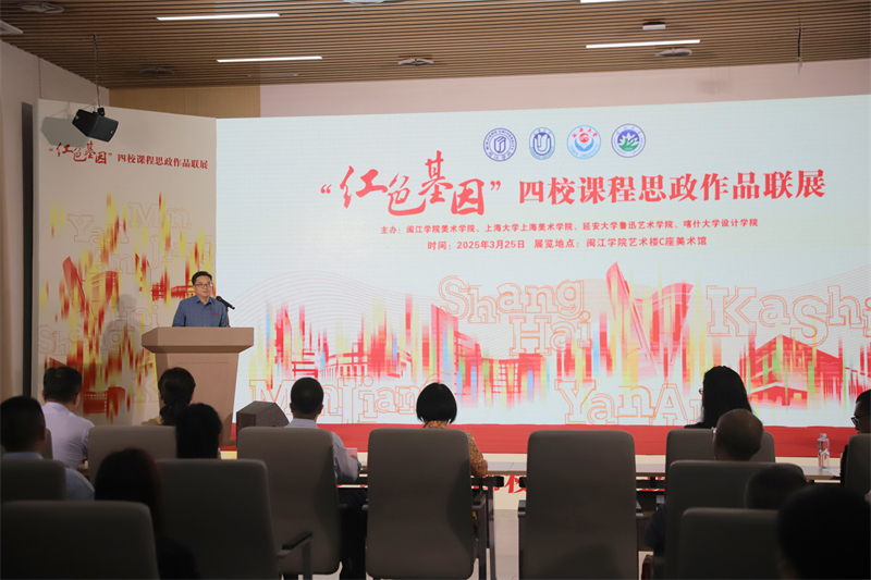 東南網藝術頻道3月26日訊(通訊員 張鑫宇)3月25日,“紅色基因——四校課程思政作品聯展”在閩江學院舉辦。本次活動由閩江學院美術學院、上海大學上海美術學院、延安大學魯迅藝術學院、喀什大學設計學院聯合主辦。閩江學院黨委常委、副校長陳興明蒞臨開幕式致辭,校黨委宣傳部部長戴少娟、團委書記王艷婷、教務處處長何偉、新聞傳播學院黨委書記陳國岱,相關主辦高校嘉賓及閩江學院美術學院師生代表200余人出席開幕式。開幕式由閩江學院美術學院黨委副書記張萬輝主持。