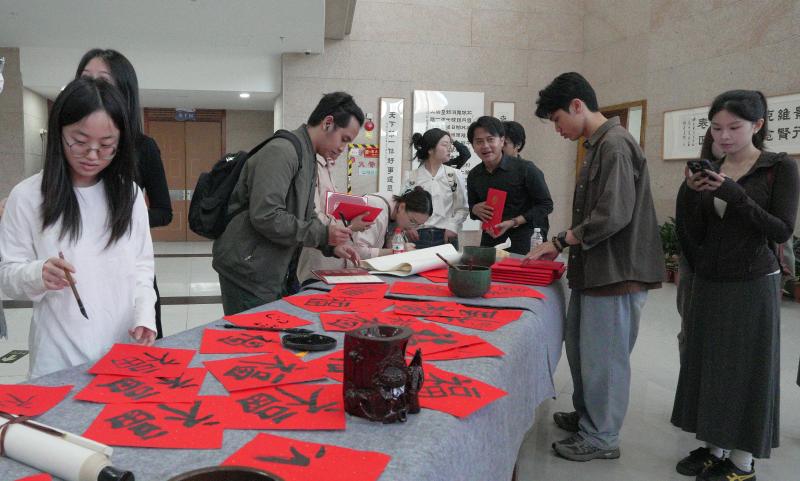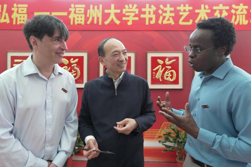 活動現場,陳吉書寫了不同字體、風格的“福” 字,并講解書法技巧和筆法運用,并與外籍教師、海外留學生、港澳臺學生進行深入交流,分享其創作“福文化” 主題書法作品的靈感來源和創作故事。