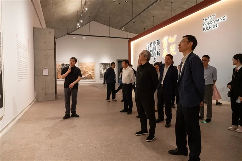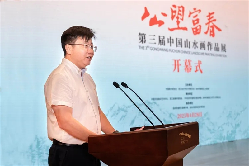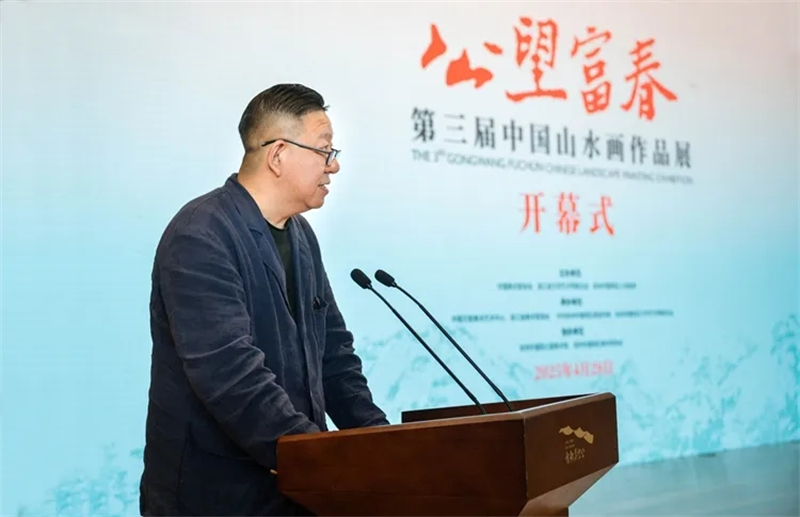 王來文在講話中指出,富陽,這片靈秀山水的土地,既是黃公望筆底煙云的永恒母題,更是新時代藝術創作的豐饒沃土,以“公望富|春”之名構建創作展陳平臺,是中國美術界貫徹落實習近平總書記倡導的“創造性轉化、創新性發展”的生動實踐、具體行動。本次展覽的作品,生動詮釋當代中國山水畫守正創新的時代圖景,特別是在“兩個結合”指引下,許多作品將傳統山水畫“可游可居”的美學理想與“美麗中國”建設實踐深度融合,讓千年文脈在新時代續寫出華彩篇章。站在新的歷史坐標上,我們要以習近平文化思想為指引,以畫為媒,深刻把握中國式現代化進程中的人文圖景,既要從黃公望“師造化、得心源”的創作觀中汲取智慧,更要踐行文藝“為人民抒情、為時代立傳”的根本宗旨,以更多彰顯中國精神、包含東方智慧的藝術創作,構筑新時代的“國風山水圖式”,為建設中華民族現代文明貢獻美術力量。