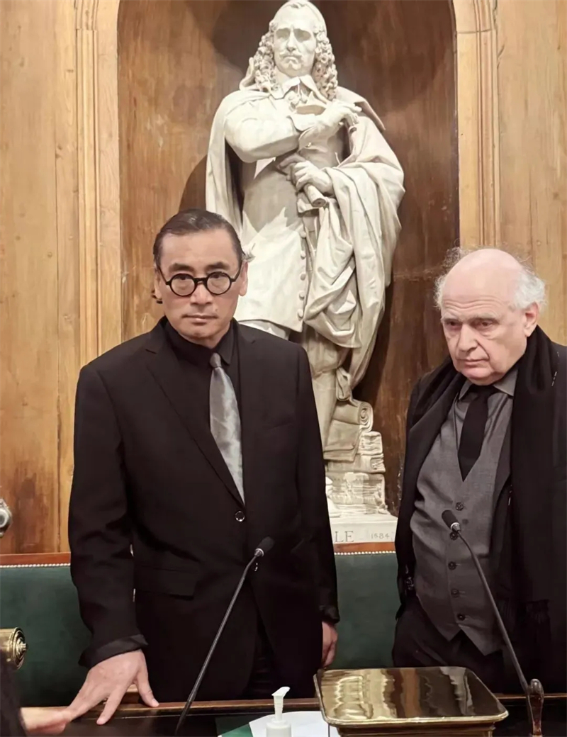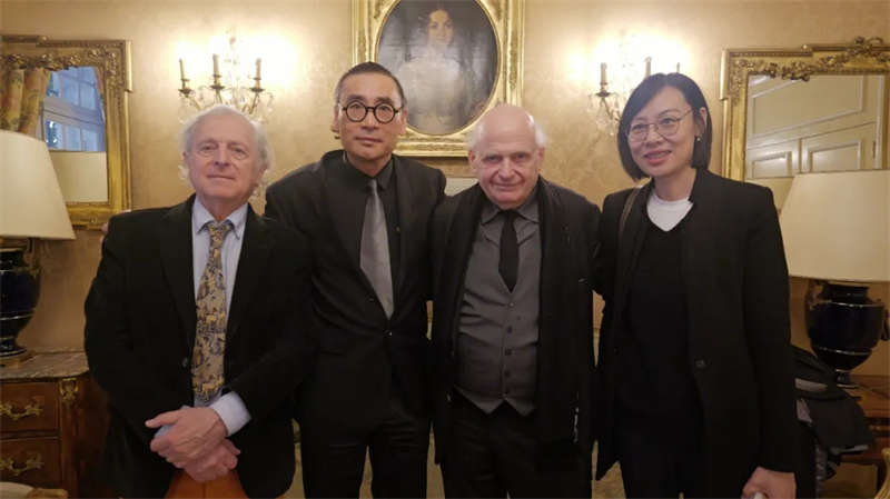 從左到右:法蘭西學院藝術院通訊院士迪埃·貝奈姆、中國國家畫院院長劉萬鳴、法蘭西學院藝術院院士、終身秘書長洛朗·珀蒂吉爾,中國駐法國大使館文化處參贊王茵