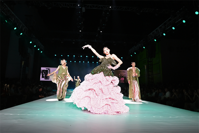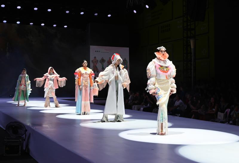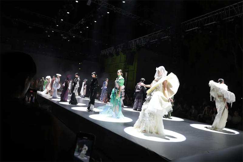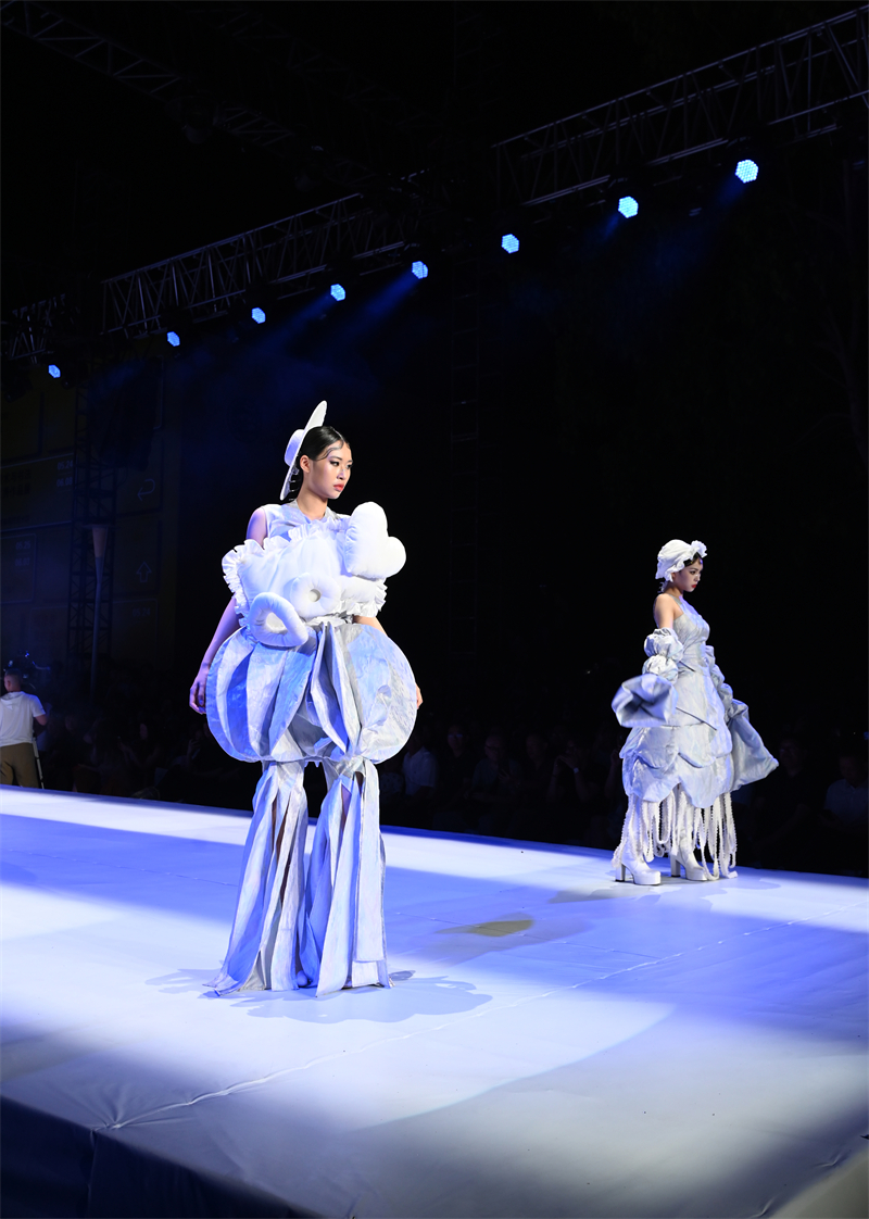 開幕式后,2025屆“啟鑰”服裝畢業設計發布會正式開始。現場共展出119套作品,包括20個本科生畢業設計、4個研究生畢業設計以及2022級同學的童裝系列設計。