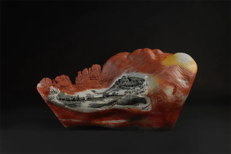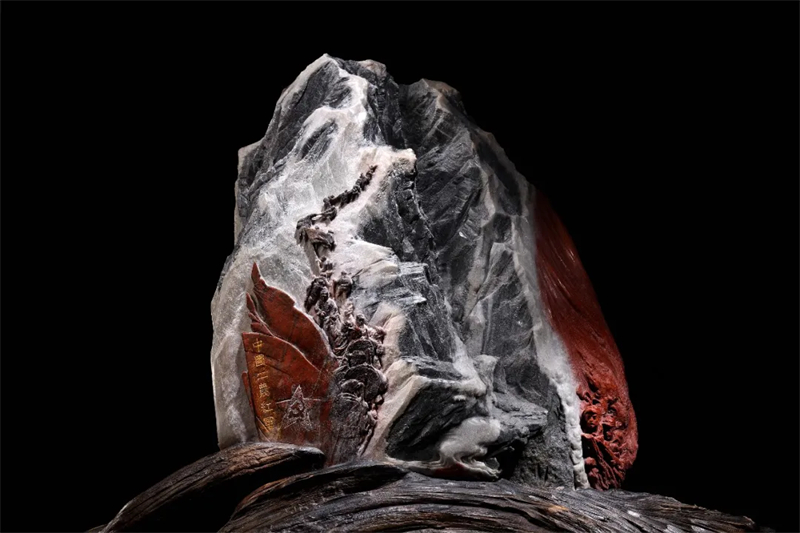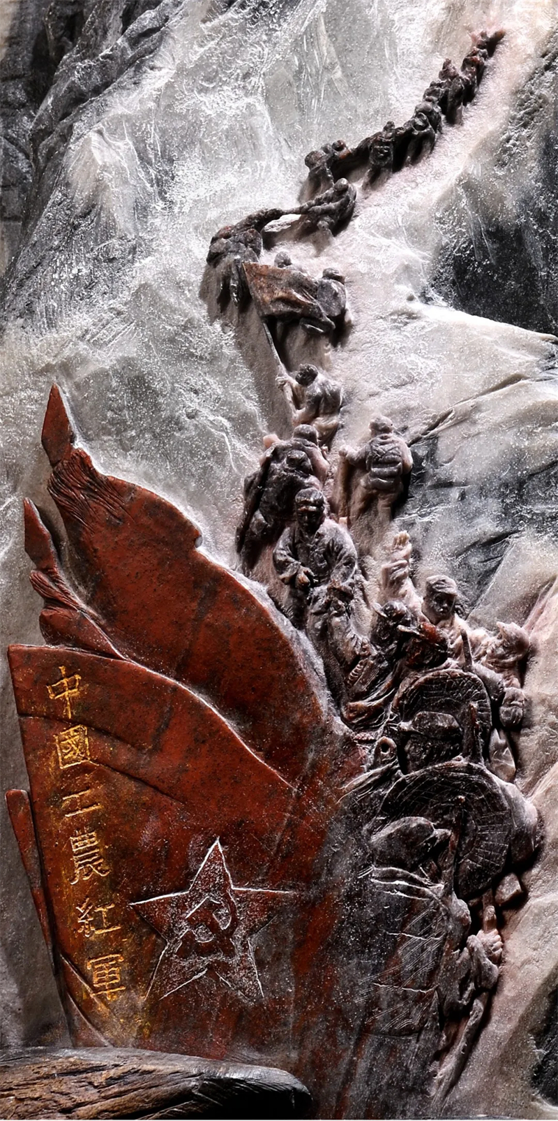 作品重達50公斤,表面溝壑起伏。主題為紅軍二萬五千里長征,作品將這個偉大壯舉濃縮成一個歷史畫卷,以石頭白色部分為基底,渲染紅軍出生入死穿越茫茫雪山的歷史場景,紅色部分則刻畫著英雄先烈們的英勇傳奇。經過近4個月的精心雕琢,數萬刀的細致打磨,這件作品最終呈現于世,并贏得了廣泛贊譽。