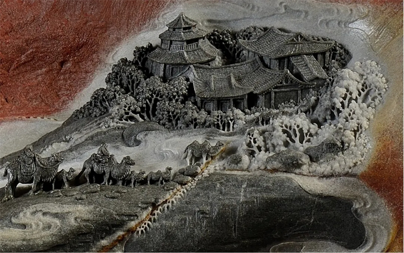 作品巧妙運用石材的自然色彩與紋理,通過色彩的運用展現了其藝術巧思。整個畫面宛如一幅敘述故事的畫卷,淋漓盡致地展現了中國畫的精粹。在雕刻過程中,刀法變化多端,將自然之美與人文精神完美融合。通過精選的石材、富有詩意的主題以及簡潔的雕刻技藝,作品將生活的美好與自然的和諧融為一體。