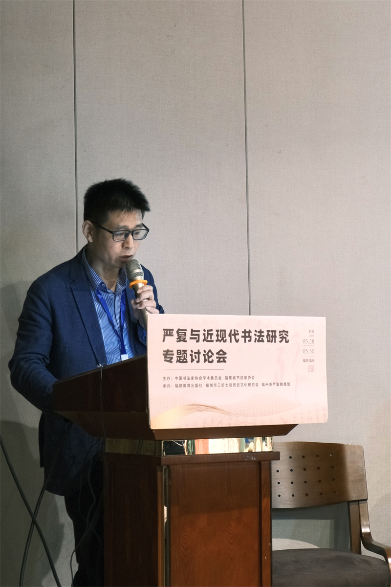 5月29日上午,嚴(yán)復(fù)翰墨館學(xué)術(shù)報告廳內(nèi),“嚴(yán)復(fù)與近現(xiàn)代書法研究”專題討論會正式啟幕。中國書協(xié)副主席、學(xué)術(shù)委員會主任葉培貴,中國美術(shù)家協(xié)會副主席、福建省文聯(lián)專職副主席王來文,福建省書法家協(xié)會名譽主席陳奮武,福建省政協(xié)經(jīng)濟(jì)委副主任、福州市三坊七巷歷史文化研究會會長林飛等領(lǐng)導(dǎo)嘉賓出席會議。王來文副主席、嚴(yán)復(fù)翰墨館館長鄭志宇、中國書協(xié)學(xué)術(shù)委員會秘書長孟慶星先后致辭,共同強調(diào)嚴(yán)復(fù)作為思想啟蒙者與書法實踐者的雙重身份,及其對當(dāng)代文化傳承的啟示意義。在專題討論會上,20余位來自全國各地的專家學(xué)者先后就專項議題做了發(fā)言。