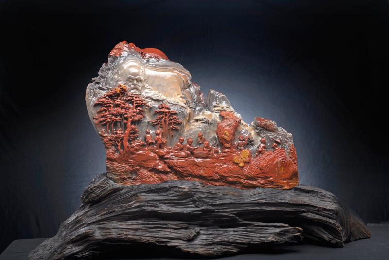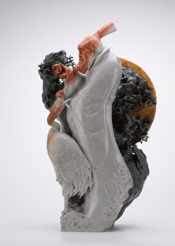 “壽山石雕講究因材施藝?!敝袊に嚸佬g大師林飛道出了壽山石雕“天工人巧”各半的創(chuàng)作哲學。林飛此次參展的作品《鴻運當頭》,利用石頭的形狀、色彩、紋理進行設計,巧妙運用天然紅、白、黑色,并將點睛之筆刻于鶴頂,傳遞著吉祥的寓意。林飛將院校所學的雕塑技法,結合傳統工藝表現唐詩宋詞、民間風俗等傳統文化內容,形成鮮明的個人風格。