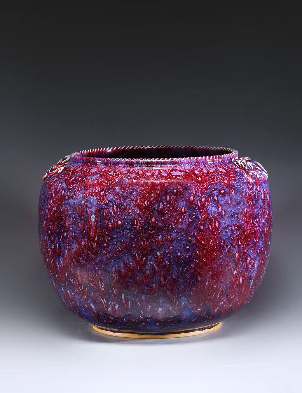 河南省工藝美術大師劉紅生攜鈞窯力作《盛世饕餮畫缸》參展。這件作品集嚴謹的工藝架構、獨特的裝飾語言和震撼的釉色表現于一體,既承載著商周青銅文明的古韻,又折射出現代藝術審美的價值。劉紅生表示:“鈞窯作為宋代五大名窯之一,以海棠紅、玫瑰紅、茄皮紫、天青月白等豐富窯變釉色著稱。此次展示的饕餮紋畫缸,融合鼓形主體與玉璧元素,結合現代審美,呈現新的視覺體驗?!?/p>