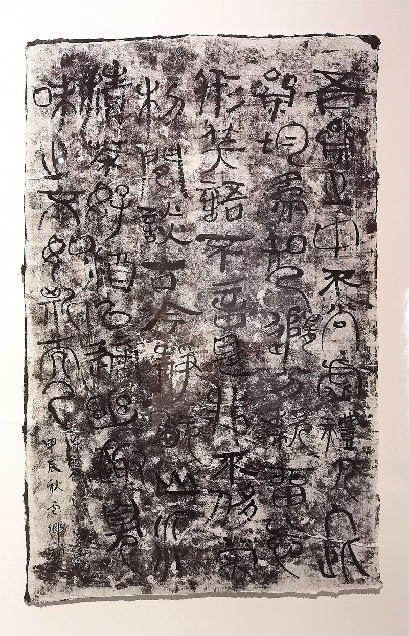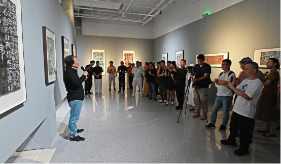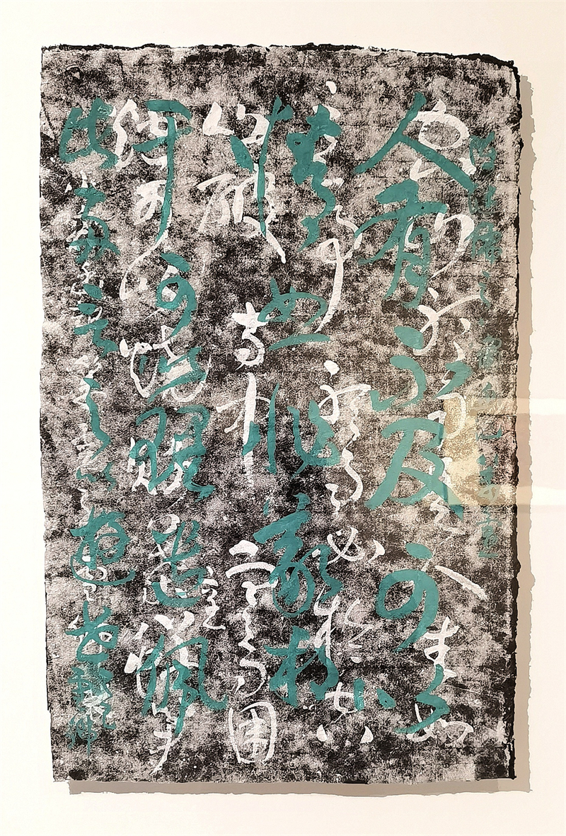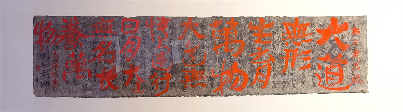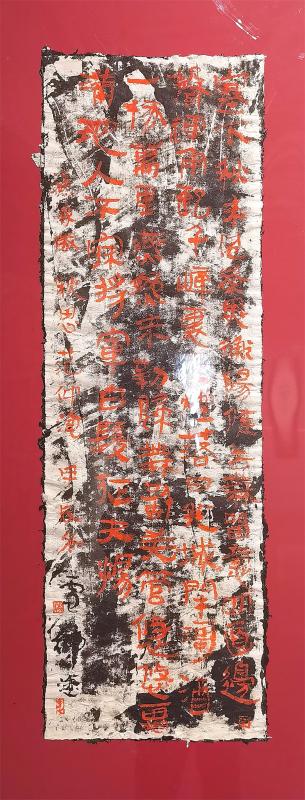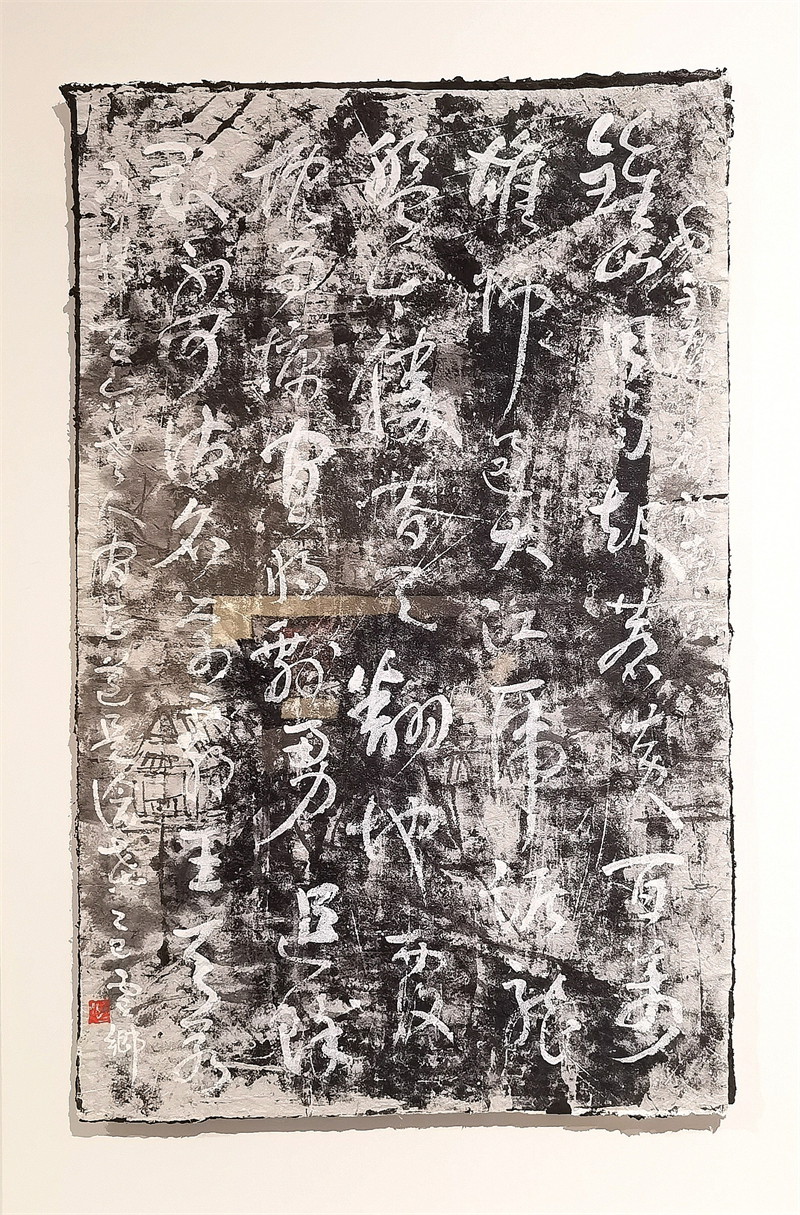 策展人高宇輝指出,中國文字書寫從早期記事到青銅銘文,再到歷代文人借筆墨抒發情志,形成了“有法之書”與“有書之法”的傳承體系。中國作為最早使用天然漆的國度,漆與文字的結合早已融入器物與空間陳設,如書柜題字、木掛聯文等,卻長期處于附屬地位。湯小剛的實驗性突破在于:他將中國文字經典的法度范式通過無意識的拆解、重組,結合纖維紙質的肌理與大漆材質,構建出兼具視覺張力與畫面感的新形態。這不僅為傳統書法藝術提供了全新的觀看維度,更恰似數字信息時代的“密碼重組”,使古老藝術在解構與重構中煥發新生。