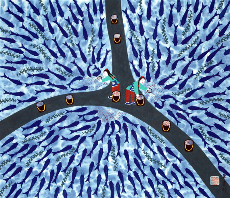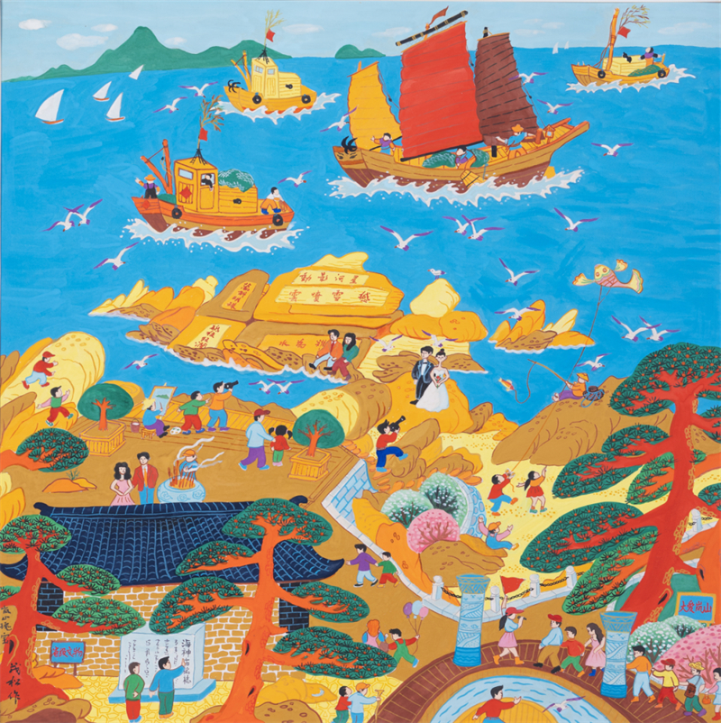 農民畫畫鄉主要集中在經濟文化底蘊深厚或民間藝術土壤豐厚的地區,在七十多年的發展進程中形成了各自鮮明的地域特色。如上海金山農民畫,汲取刺繡、剪紙、灶壁畫等傳統藝術,把水鄉清新而芬芳的泥土風韻與現代農村豐富的生活氣息融為一體,是在江南民間美術土壤中滋生出來的一朵奇葩;浙江舟山漁民畫風格奇幻、神秘、抽象近乎怪誕,造型夸張隨意,色彩艷麗強烈,具有濃郁的海洋文化特色;江蘇邳州農民畫造型夸張質樸,賦予物象稚拙生命力,色彩以紅、綠、黃等原色為主,形成強烈視覺沖擊;山東日照農民畫以“隨心賦彩、以心造像”為理念,構圖飽滿,色彩對比強烈,充滿積極明快的生命張力;重慶綦江農民版畫源自明清年間的木版年畫,具有古樸稚拙、夸張浪漫的獨特風格;貴州水城農民畫以“色彩艷麗、對比強烈”著稱,常用大紅、明黃、翠綠等高飽和度色調,借鑒蠟染與刺繡的配色邏輯,形成視覺沖擊力;