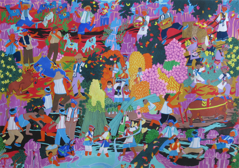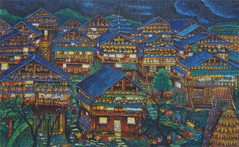 農民畫畫鄉廣泛分布在全國各省市、自治區,從華東地區的江蘇邳州、徐州,上海金山,浙江舟山、秀洲,福建晉江、龍海、同安、漳平,江西湘東、蘆溪,山東日照;到西北地區的陜西戶縣、安塞,青海湟中,寧夏隆德,新疆麥蓋提;從華北地區的河北辛集,天津北辰,山西代縣;到東北地區的吉林東豐、樺甸,遼寧彰武、莊河,黑龍江綏棱、賓縣;從華中地區的河南內黃、舞陽,湖北黃岡,湖南常寧、隆回;到華南地區的廣東龍門,廣西三江;到西南地區的云南省官渡、騰沖,貴州水城,重慶綦江,四川井研縣……質樸的農民畫作者不受專業技法的束縛,卻以最真摯的情感、最鮮活的視角,描畫熱火朝天的鄉村生活,表達對幸福生活的美好憧憬,讓農民畫在美術百花園里綻放出獨特的光彩。