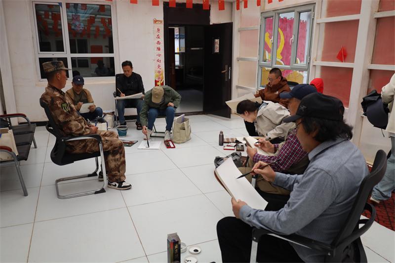 親歷邊防,美術(shù)家們深受震撼。7月15日,在克州吉根鄉(xiāng)巴依瑪提護邊員執(zhí)勤點,美術(shù)家們直面戍邊人的堅守。中國美院教授周剛在哨所為護邊員畫像時激動不已:“畫不出他們的那種平凡、堅韌、樸實卻高大的形象……他們踐行著,一生只做一件事,我為祖國守邊疆?!睆V州畫院專職畫家李夏夏目睹不同民族戰(zhàn)士共守國門,“冷風(fēng),細(xì)雨伴隨著淚水模糊了我的視線”,她立刻在崗樓里拿出畫筆記錄下戰(zhàn)士的面容,“帕米爾高原的風(fēng)雪與陽光在他們的臉上留下了豐富的色彩痕跡?!毙陆a(chǎn)建設(shè)兵團美協(xié)名譽主席秦建新將“人民楷?!辈既悻敽埂っ斩洹捌椒捕鴤ゴ蟮挠⑿凼论E”稱為“一堂生動的微黨課”,認(rèn)為這是對“美術(shù)家們的一次理想信念的精神洗禮”。