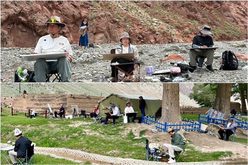 采風(fēng)活動在克州第十一屆瑪納斯國際文化旅游節(jié)開幕之際啟程,美術(shù)家們經(jīng)過九天跋涉,走進祖國西陲的邊防哨所、帕米爾高原的冰川湖泊、南疆燦爛的民族村落與歷史遺跡開展采風(fēng)寫生。他們以畫筆為媒,在行走中感受,在寫生中思考,深情記錄新時代新疆的壯美畫卷與發(fā)展脈動。此次新疆段“大采風(fēng)活動”聚焦“守衛(wèi)邊疆”與“民族團結(jié)”兩大主題,每一天的行程都成為美術(shù)家體悟“美術(shù)里的新時代”的生動注腳。