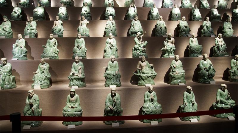 這份殊榮,源于一團泥土與千年窯火的涅槃重生。陳萬龍大師出身五代制瓷世家,深研青瓷三十余載,以近乎癡迷的執著,循著宋元古窯的基因密碼,復原“翠色天成”之妙釉,融合莆仙深厚的神佛造像傳統與人文精神,終成此氣象宏大、法相莊嚴的五百羅漢群像。五百尊羅漢,尊尊形態各異,或怒目降魔,或低眉慈悲,或詼諧自在,平均高45厘米,最高達63厘米,栩栩如生,盡顯方寸瓷胎間的宇宙萬象與東方智慧,是技藝、藝術與禪意的完美融合。
