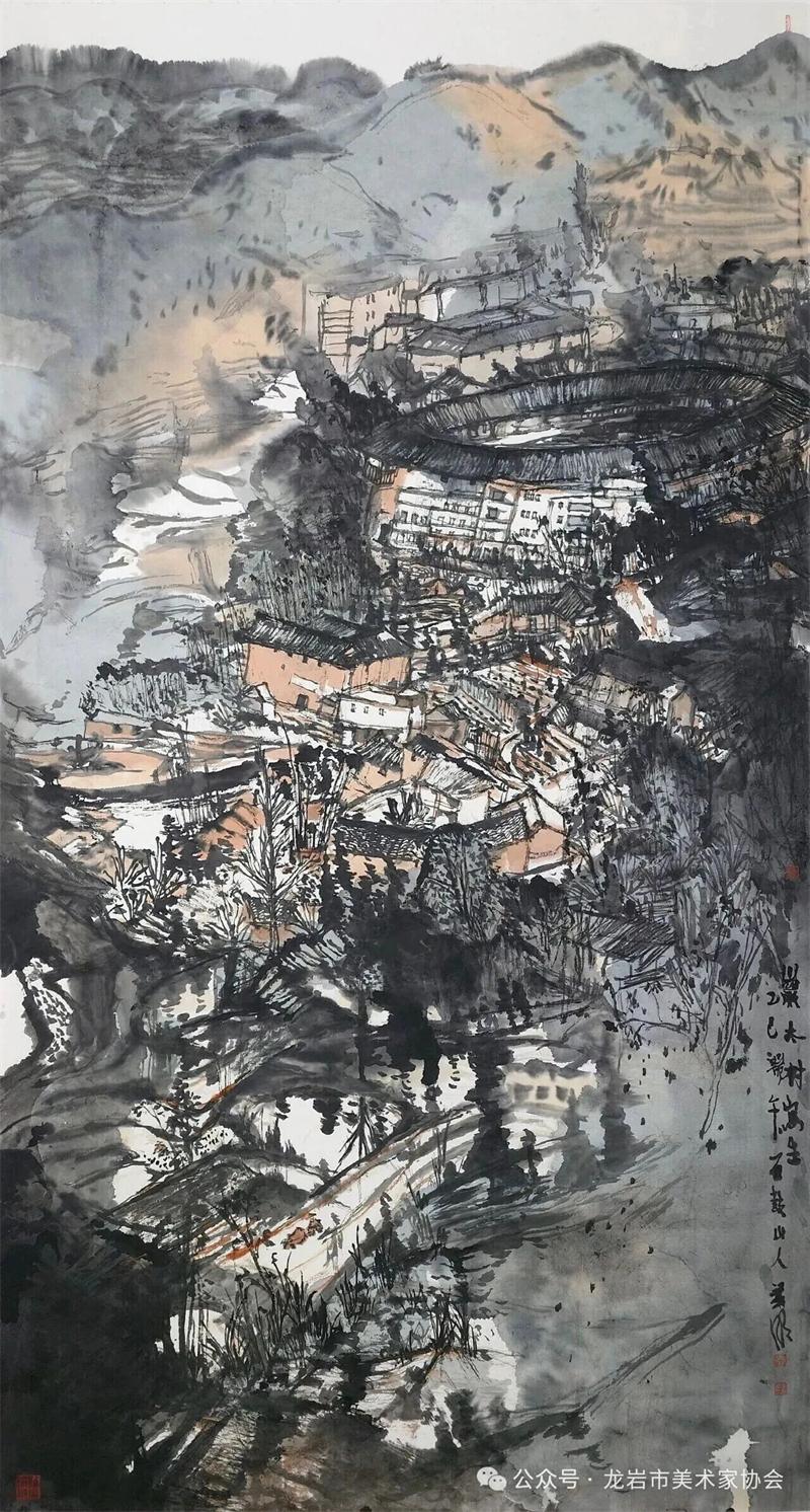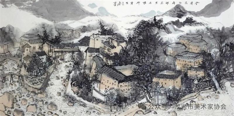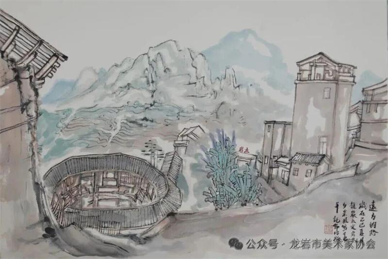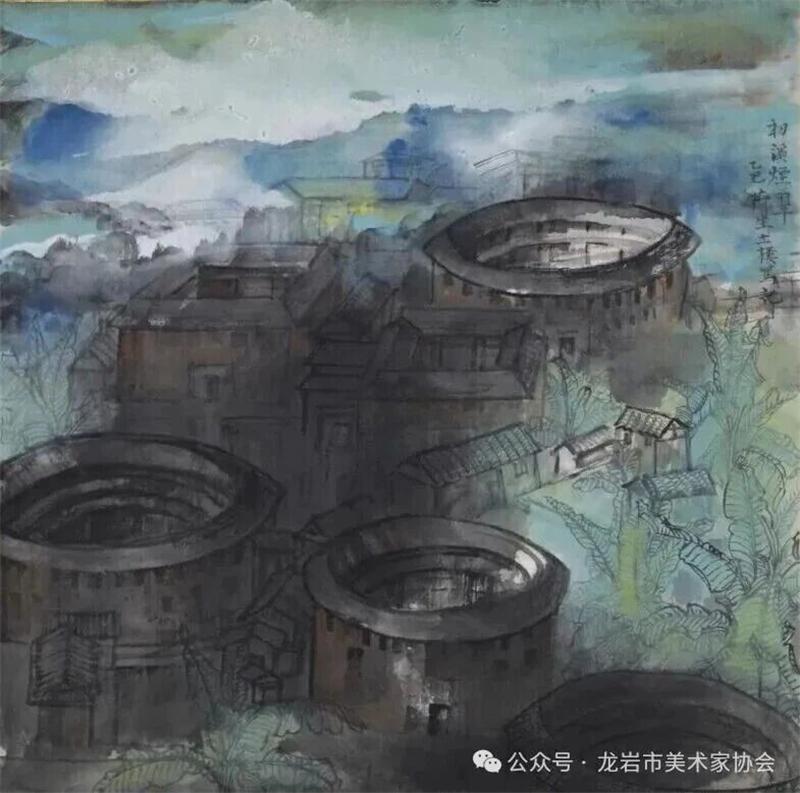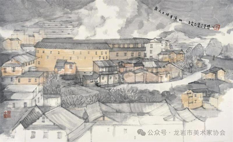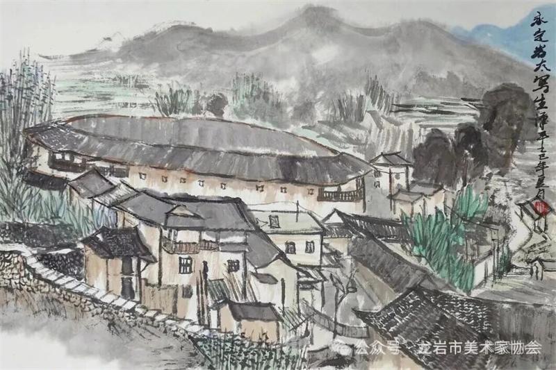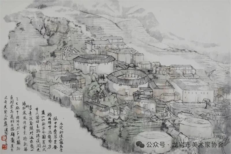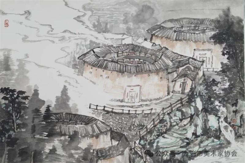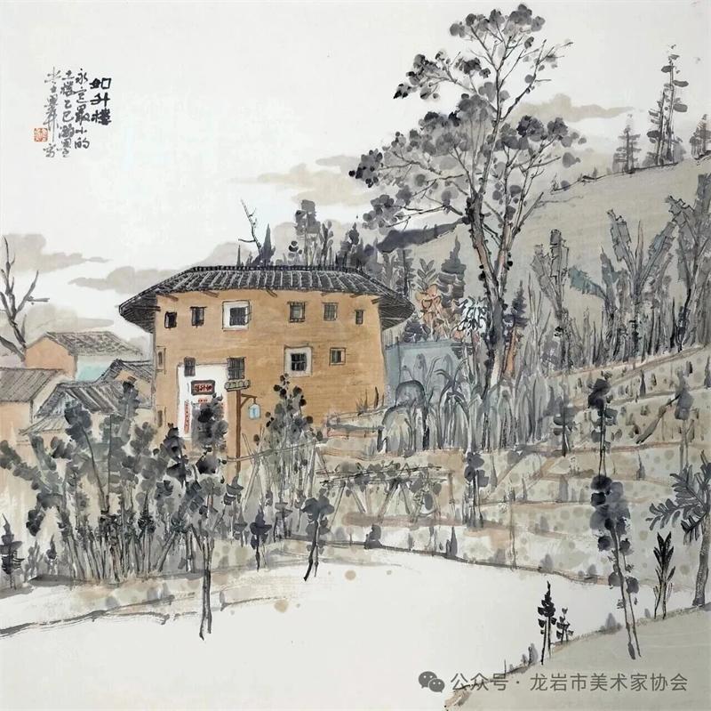 藝術家們懷揣對傳統文化的敬畏之心,扎根永定厚重的文化沃土,以多元的藝術視角與精湛的創作技法,為永定土樓注入鮮活的藝術生命力。在筆墨揮灑間,初溪土樓群依山傍水、層疊起伏的壯闊畫卷徐徐展開;振成樓融合中式飛檐與西式廊柱的精巧細節被細致刻畫,盡顯中西合璧的建筑智慧;承啟樓 “高四層、圈四圈” 的恢弘格局躍然紙上,讓人直觀感受客家建筑的磅礴氣勢;南溪土樓溝延綿十余公里的悠遠意境,在水墨暈染中化作流動的長卷,將土樓與自然的和諧之美展現得淋漓盡致。創作既注重建筑與自然的空間對話,也生動表現土樓人家炊煙裊裊、耕讀傳家的生活場景,在筆墨點染間凝聚客家民系艱苦奮斗、敬祖重教、愛國愛鄉的精神史詩。
