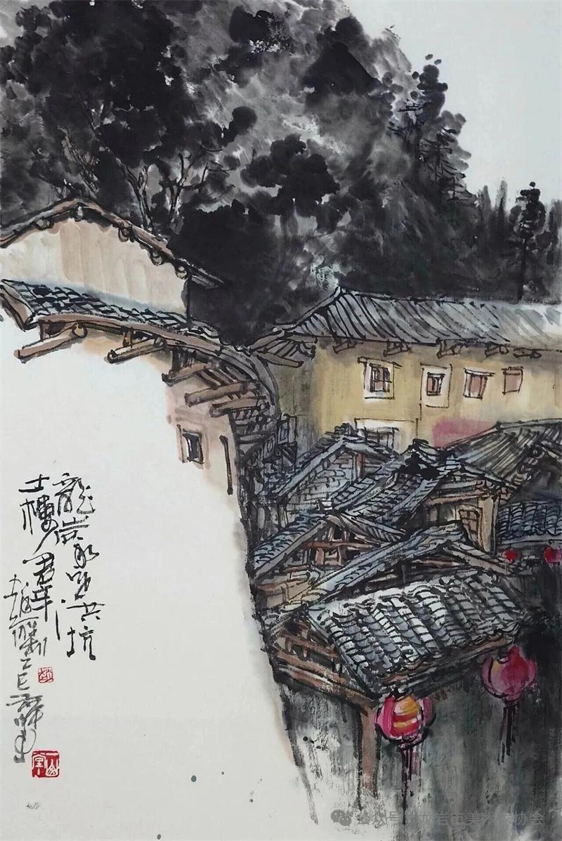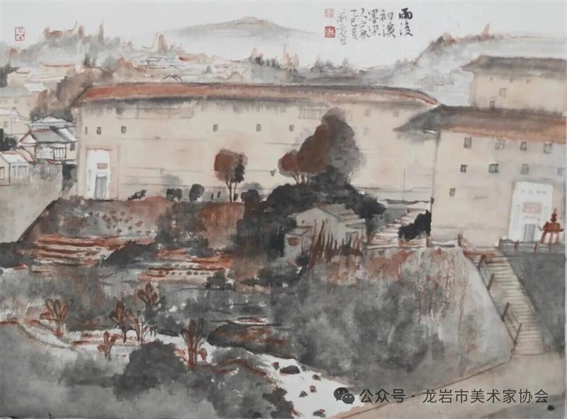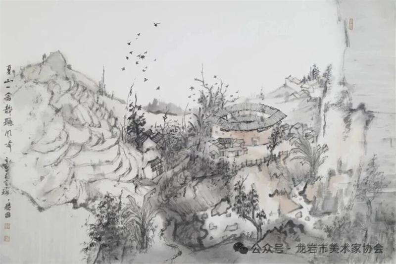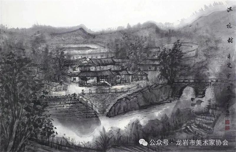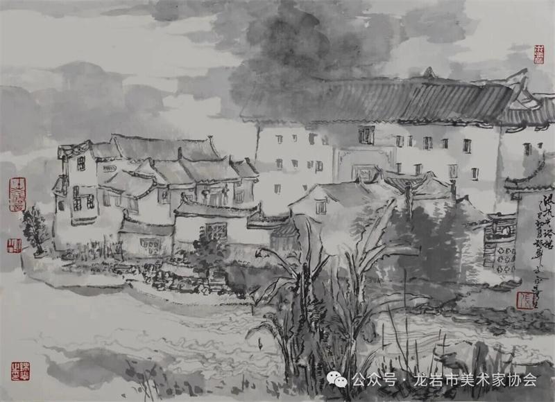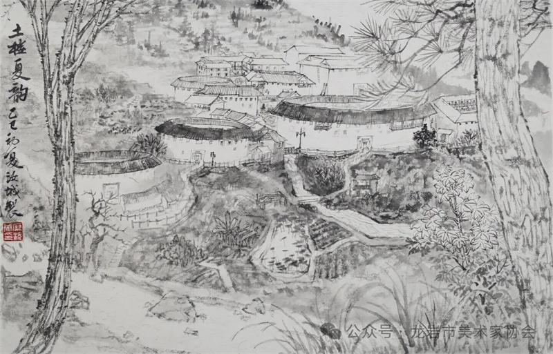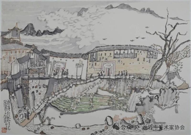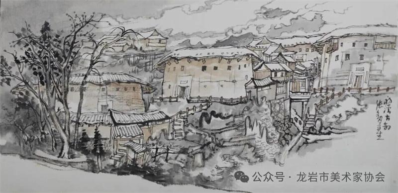藝術家們懷揣對傳統文化的敬畏之心,扎根永定厚重的文化沃土,以多元的藝術視角與精湛的創作技法,為永定土樓注入鮮活的藝術生命力。在筆墨揮灑間,初溪土樓群依山傍水、層疊起伏的壯闊畫卷徐徐展開;振成樓融合中式飛檐與西式廊柱的精巧細節被細致刻畫,盡顯中西合璧的建筑智慧;承啟樓 “高四層、圈四圈” 的恢弘格局躍然紙上,讓人直觀感受客家建筑的磅礴氣勢;南溪土樓溝延綿十余公里的悠遠意境,在水墨暈染中化作流動的長卷,將土樓與自然的和諧之美展現得淋漓盡致。創作既注重建筑與自然的空間對話,也生動表現土樓人家炊煙裊裊、耕讀傳家的生活場景,在筆墨點染間凝聚客家民系艱苦奮斗、敬祖重教、愛國愛鄉的精神史詩。