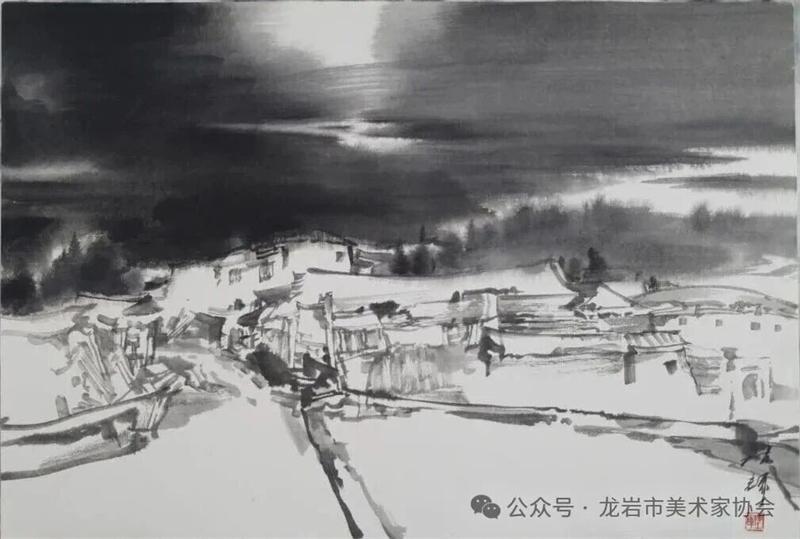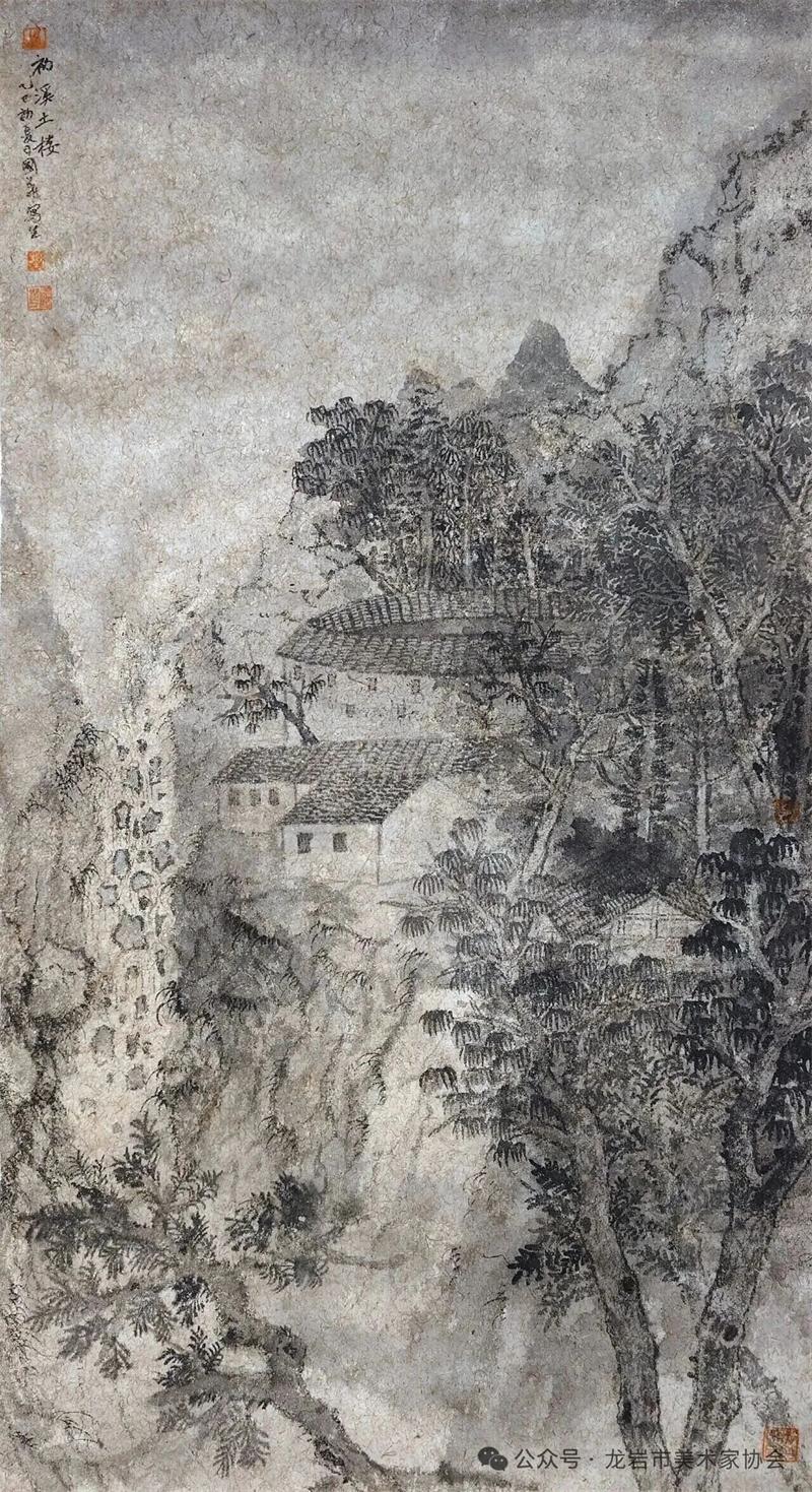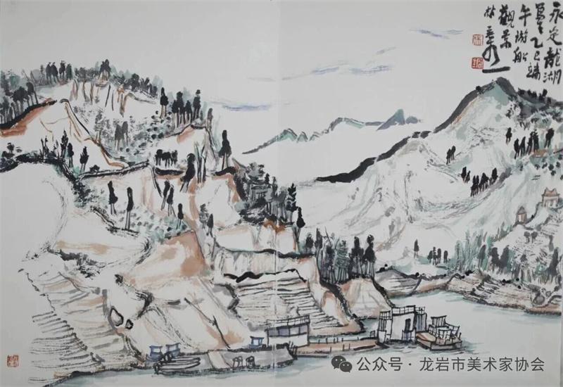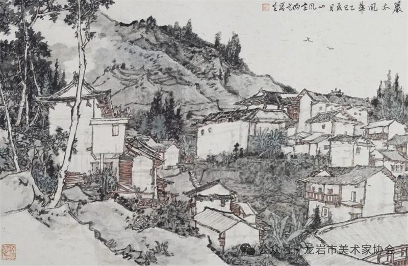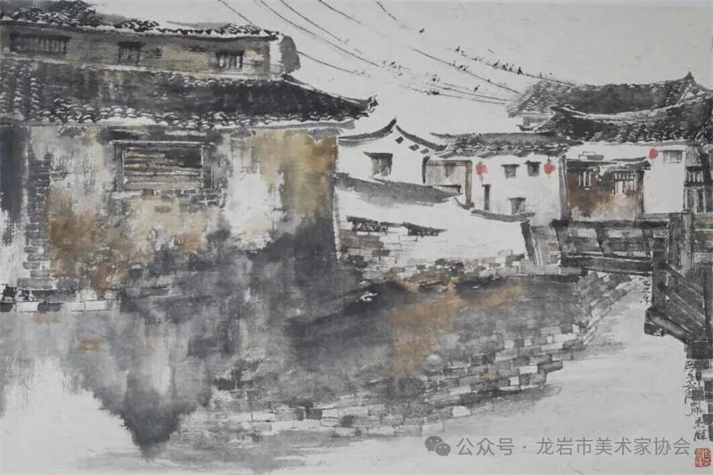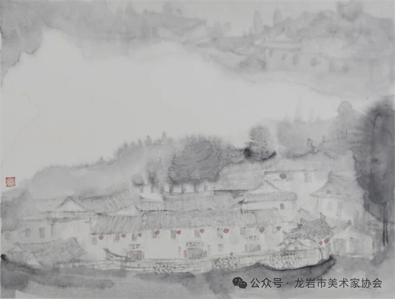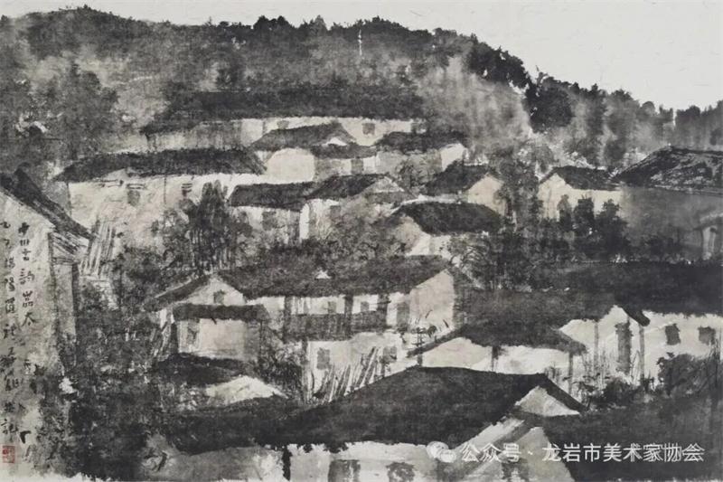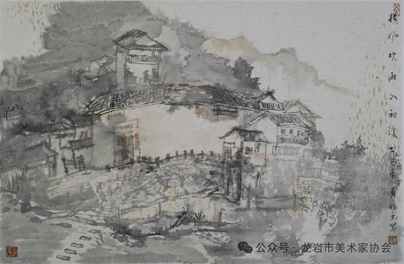 藝術家們懷揣對傳統文化的敬畏之心,扎根永定厚重的文化沃土,以多元的藝術視角與精湛的創作技法,為永定土樓注入鮮活的藝術生命力。在筆墨揮灑間,初溪土樓群依山傍水、層疊起伏的壯闊畫卷徐徐展開;振成樓融合中式飛檐與西式廊柱的精巧細節被細致刻畫,盡顯中西合璧的建筑智慧;承啟樓 “高四層、圈四圈” 的恢弘格局躍然紙上,讓人直觀感受客家建筑的磅礴氣勢;南溪土樓溝延綿十余公里的悠遠意境,在水墨暈染中化作流動的長卷,將土樓與自然的和諧之美展現得淋漓盡致。創作既注重建筑與自然的空間對話,也生動表現土樓人家炊煙裊裊、耕讀傳家的生活場景,在筆墨點染間凝聚客家民系艱苦奮斗、敬祖重教、愛國愛鄉的精神史詩。