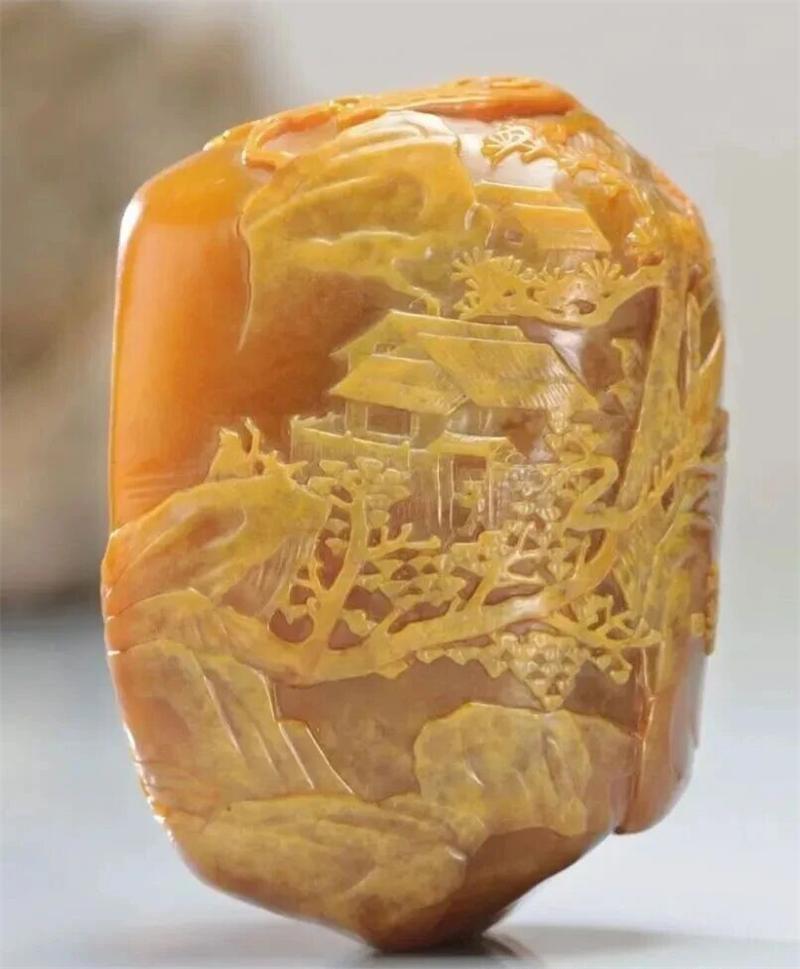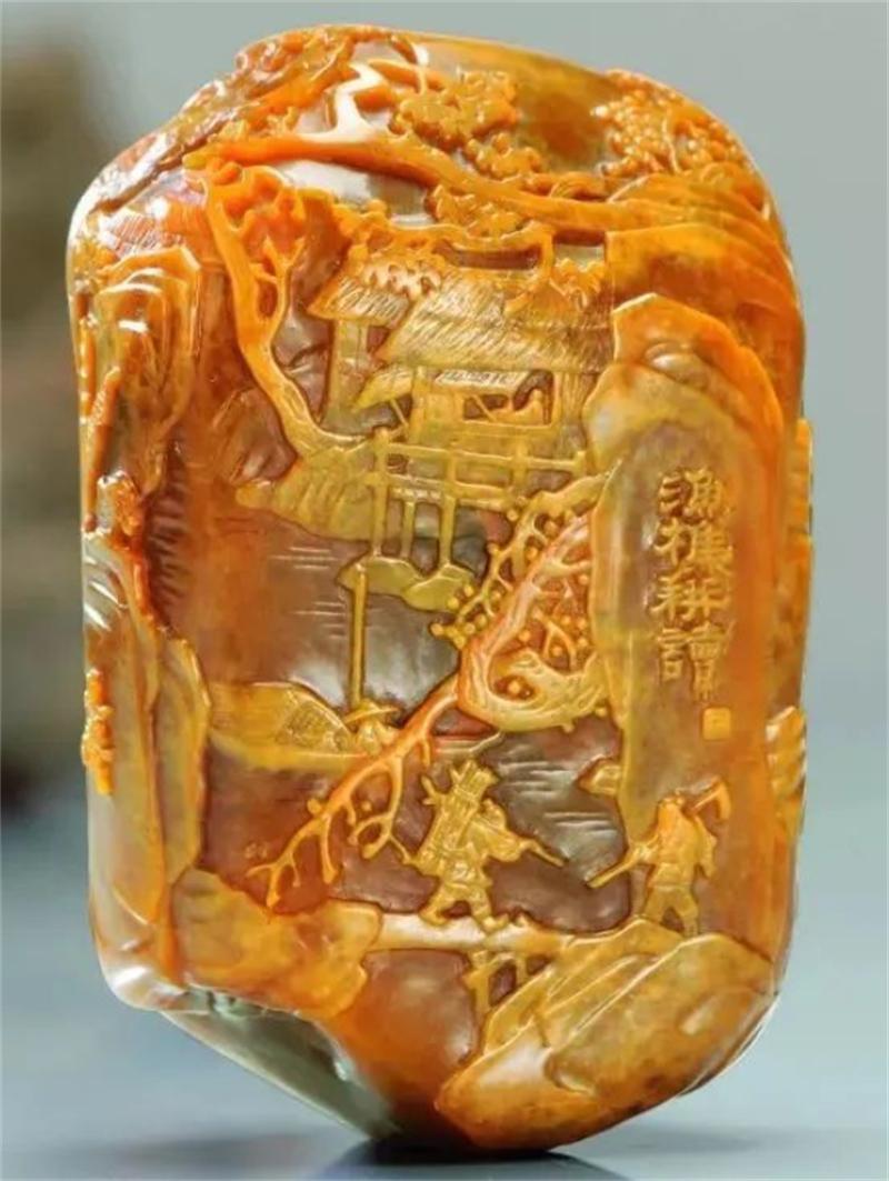 從作品造型來看,其形制飽滿圓潤,色澤內(nèi)斂含蓄,石皮斑駁,散發(fā)著雅致高古的獨特韻味。林文舉大師巧妙借助石材肌理,精心雕琢出巍峰窮谷,塑造出峭拔嶙峋的磅礴氣勢。畫面中,遒勁老樹、邈絕磴道等元素點綴其間,整體呈現(xiàn)出秀美之態(tài),營造出與世隔絕的靜謐氛圍。中間留白處以短線勾勒水波元素,一潭湖水躍然眼前,為畫面增添了靈動之感。